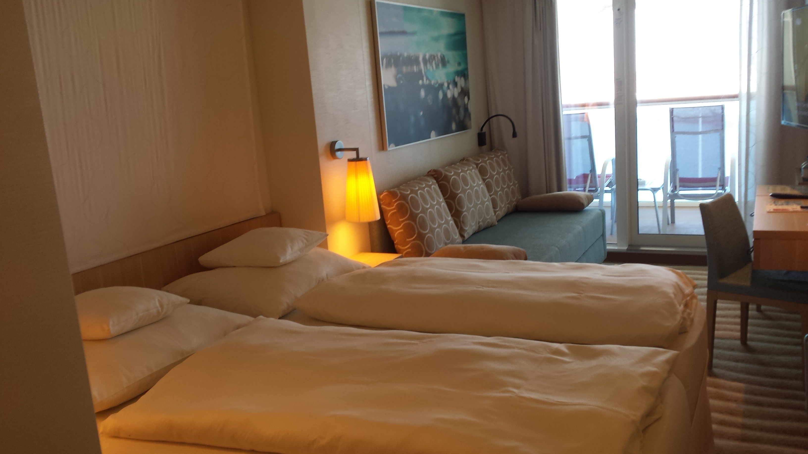 Die Betten stehen in Fahrtrichtung, das Sofa mit dem zusätzlich aufklappbaren Bett steht quer dazu und ist näher am Balkon