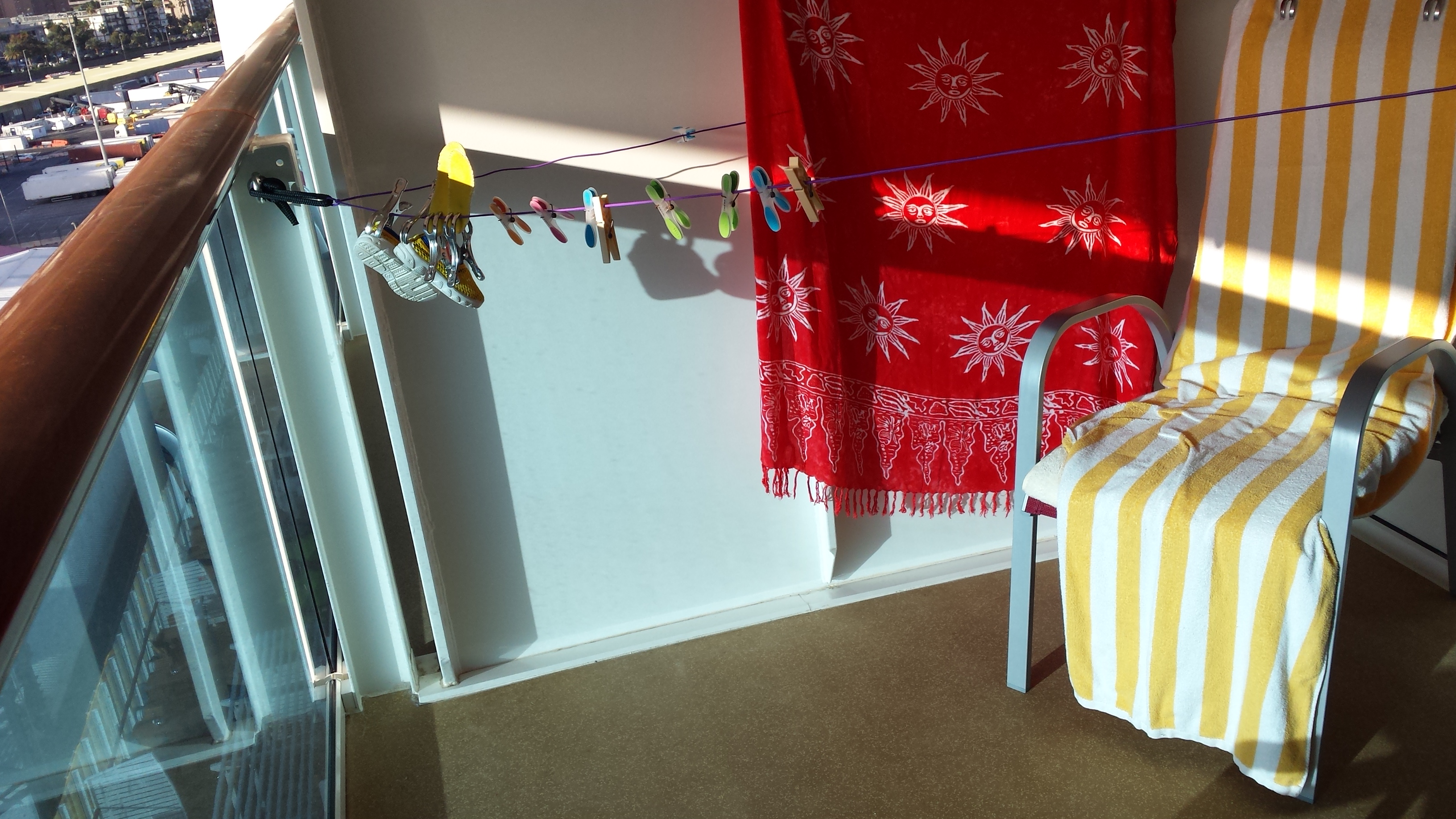 Leider ist die Kabine unter dem großen (3 m, 4 m?) Dachvorsprung, so dass so gut wie keine Sonne auf den Balkon kommt. Morgens hatten wir mal von 7.30 bis 8 Uhr sonne ![]()