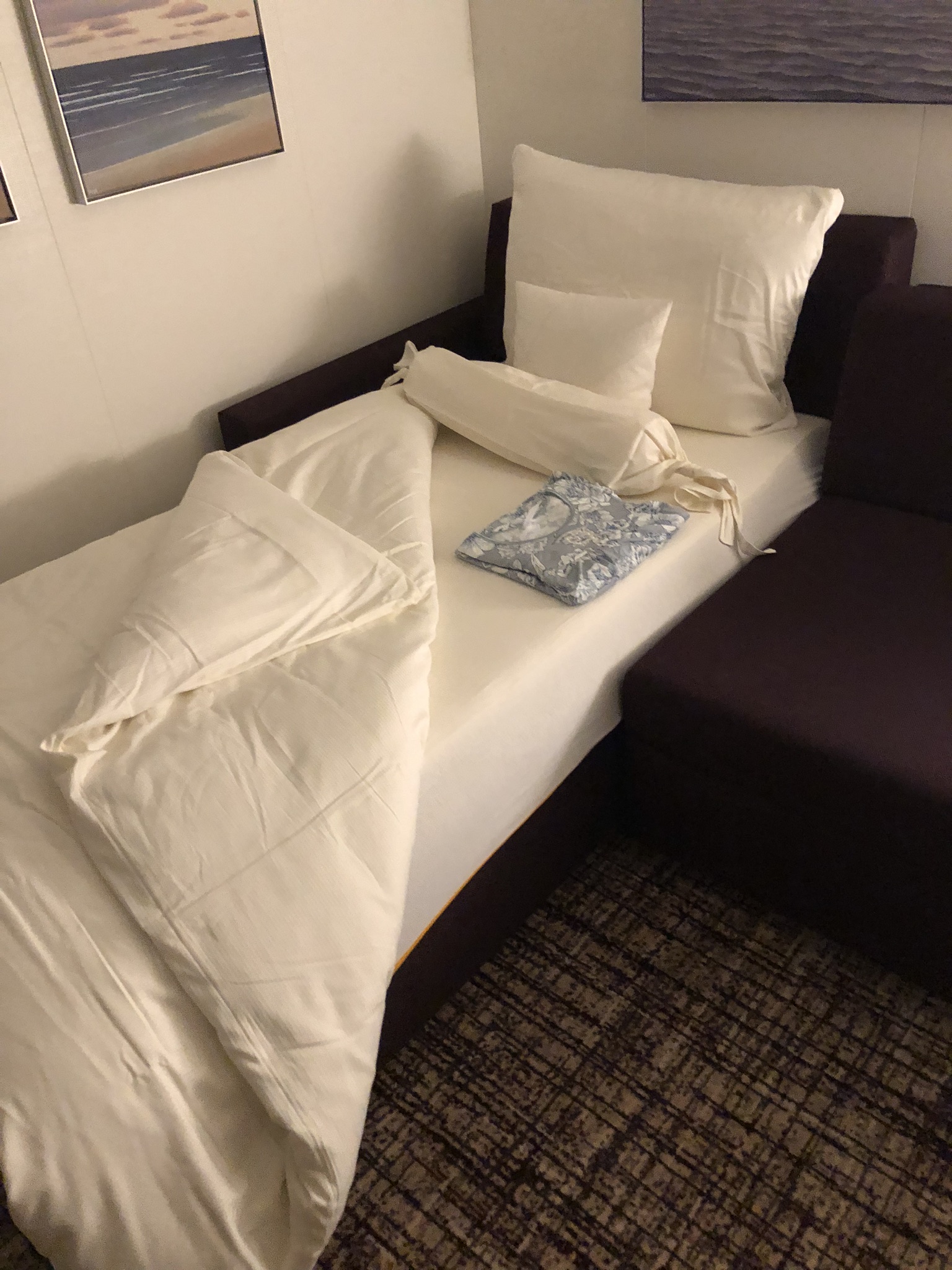 Wir waren nicht auf der Nova, sondern auf der Prima bzw. Perla. Dort durfte ich auf das Sofabett, welches mir eindeutig zu hart war. Mit Skoliose-Korsett kann ich mir das Sofabett ohne weitere Unterlage nur für ein sehr leichtes Kind vorstellen.