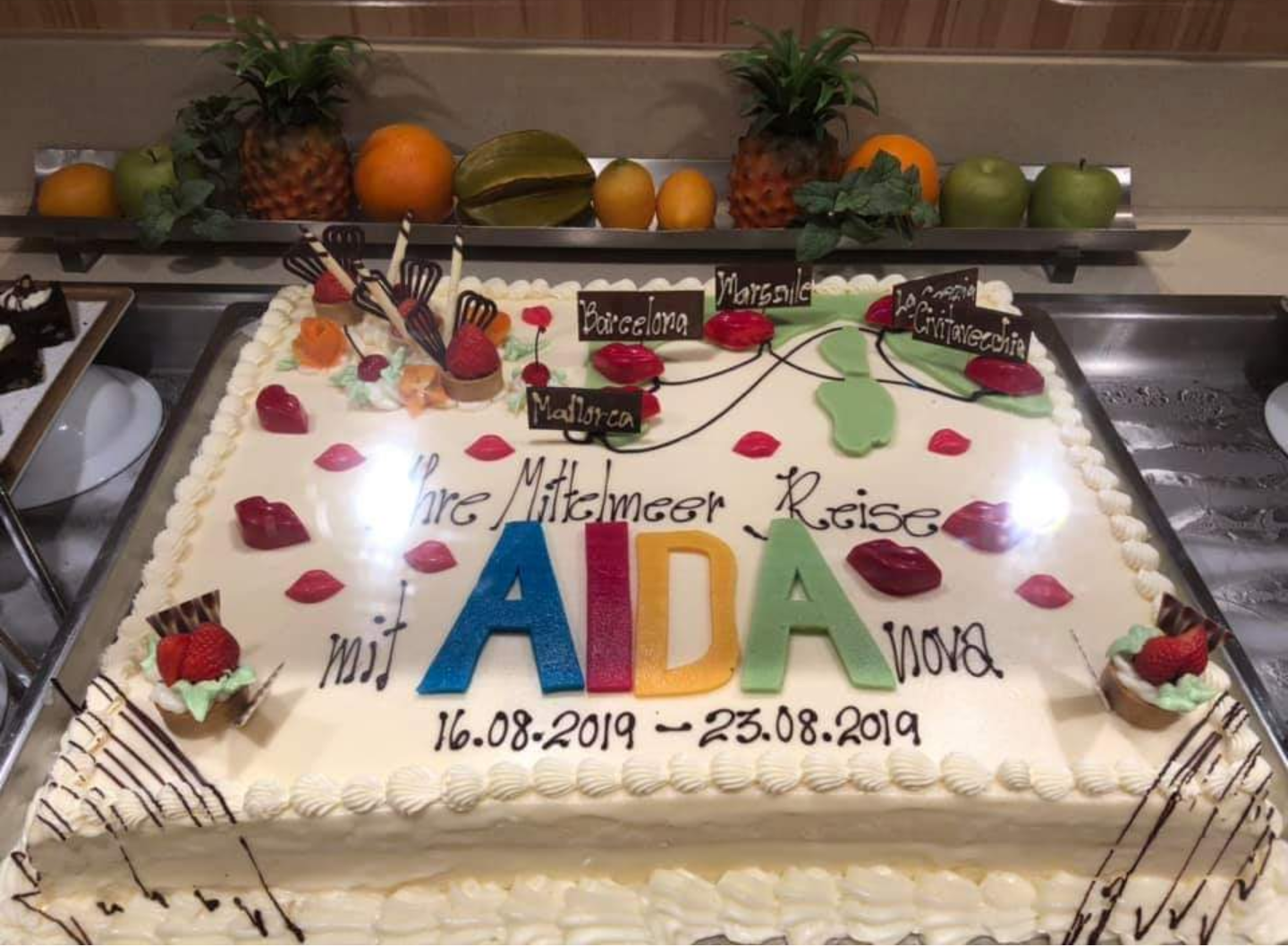 Ein Tipp von mir: In der AIDA-Lounge läuft derzeit ein Gewinnspiel: "Ein Jahr Nova". Da sind Reisende aufgerufen, Fotos zu verschiedenen Nova-Thema zu posten. Das gestrige Thema war "kulinarische Highlights". Möglicherweise hat ja auch jemand ein Foto der Routentorte gepostet?! Schau doch dort mal rein. Solltest du fündig werden, könntest du ja den User mal anschreiben, ob er dir das Foto zur Verfügung stellen könnte?!