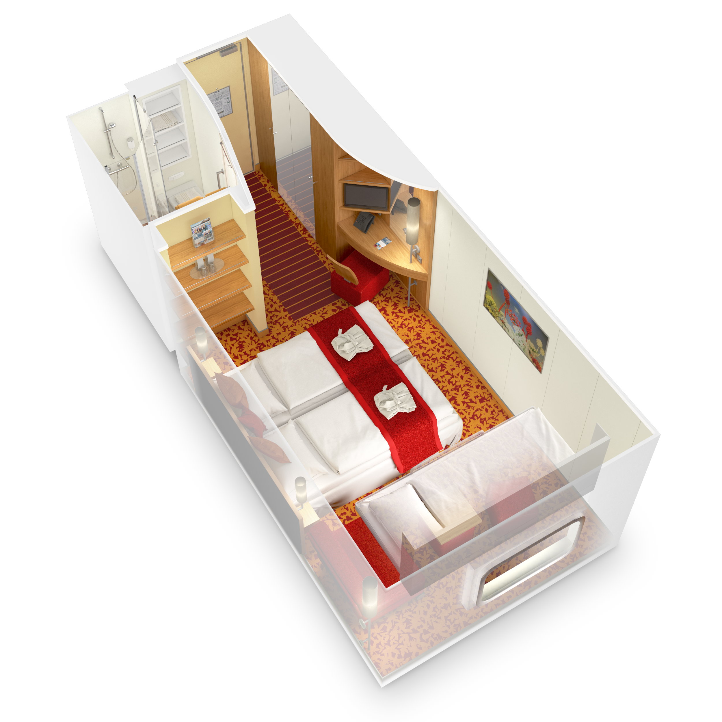Auf den Schiffen der Melittaklasse kenne ich es nur so, wie auf dem Bild, Doppelbett, Sessel und vor dem Fenster/Balkontür das Pullmanbett. Habe es noch nie anders gesehen auf der Schiffsklasse.