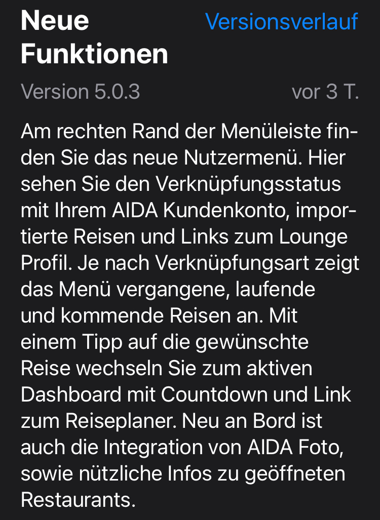 Und für myAIDA musst du ein Stück runterscrollen, da steht dann so ein blauer Balken mit „Urlaubsplaner“. Da sind dann wieder alle drin, oben direkt unter dem Countdown nur noch die kommende.