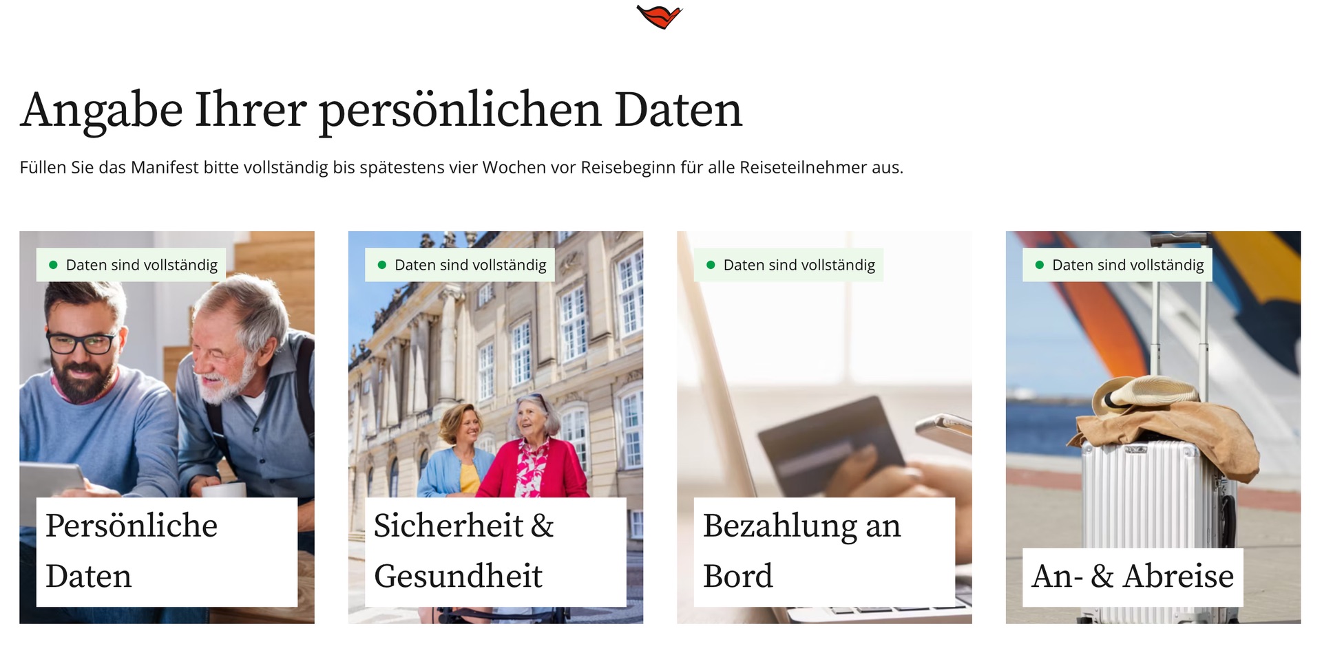 Hatte gestern mit der Tochter das Manifest für unsere September Tour vollständig ausgefüllt. Es steht auch überall da -100 % bzw. Daten vollständig vorhanden - außer in der AIDA App. Da steht nach wie vor am Bildrand oben der blaue Hinweis. Hatte gestern Abend auch nochmal alles durchgeschaut und die Nacht abgewartet, Reisen neu verknüpft, Apfel aus und wieder an gemacht - Ergebnis heute Morgen siehe Bild