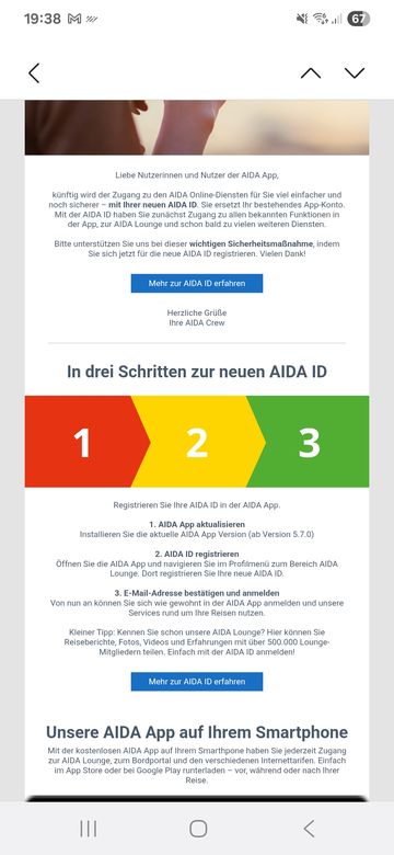 Die Mail scheint korrekt zu sein. AIDA beginnt mit den persönlichen Informationen zum Update und zur richtigen Handhabung der AIDA App.