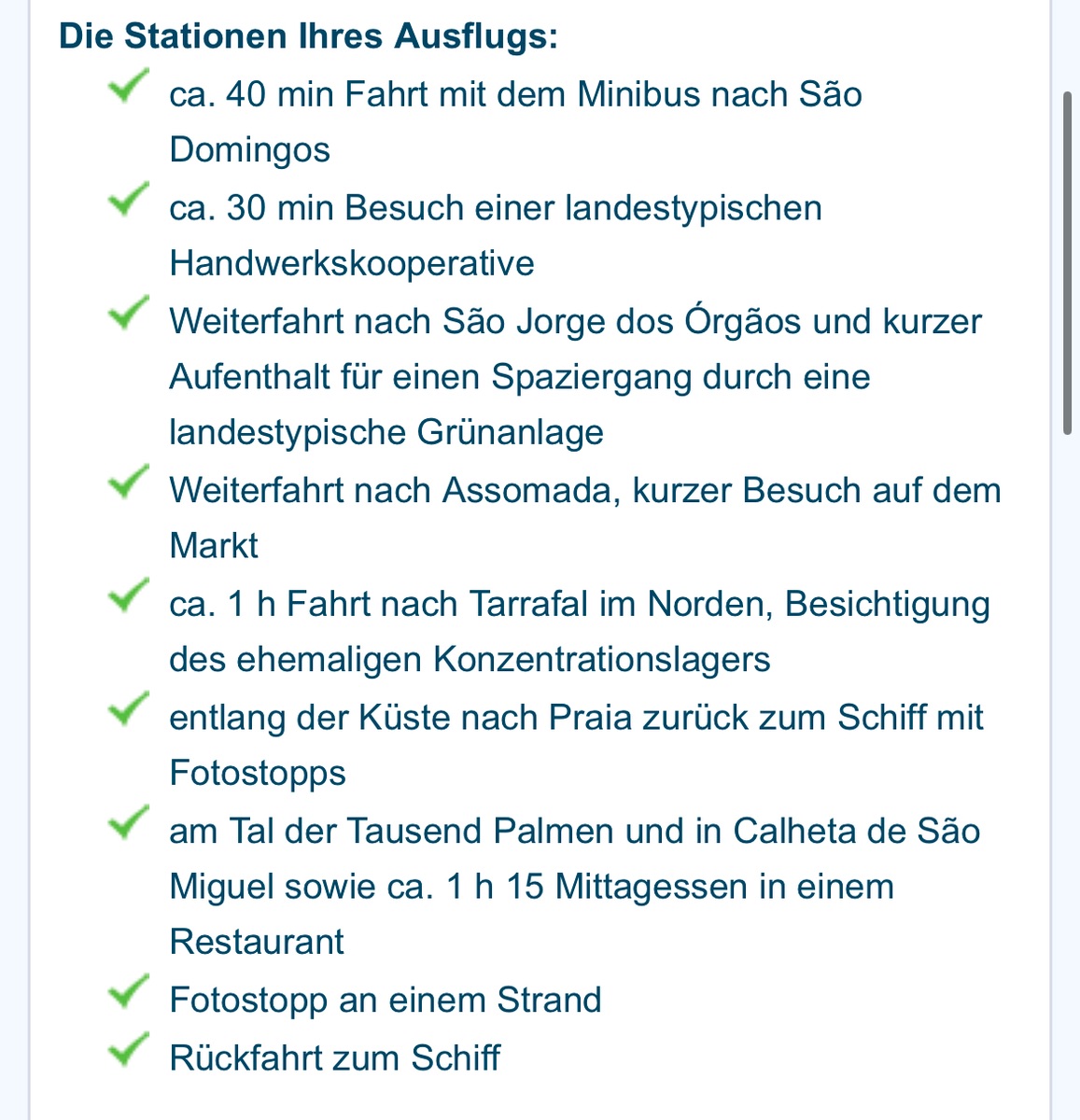 Privat würde ich das nicht buchen. Wir waren im Winter 24 2x in Praia und an beiden Tagen war in Praia absolutes Verkehrschaos und man kam deshalb nur schlecht zurück zum Schiff. Wegen der verspäteten Ausflüge wurde dann auch später abgelegt.