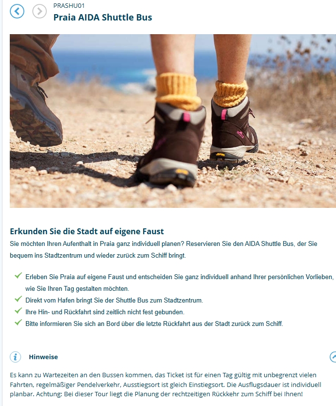 Auf unserer letzten Reise mit AIDAprima im November 2024 gab es einen und auch auf der kommenden Reise mit AIDAstella nächste Woche könnten wir bereits über MyAida einen Shuttle in Praia für € 15 buchen: