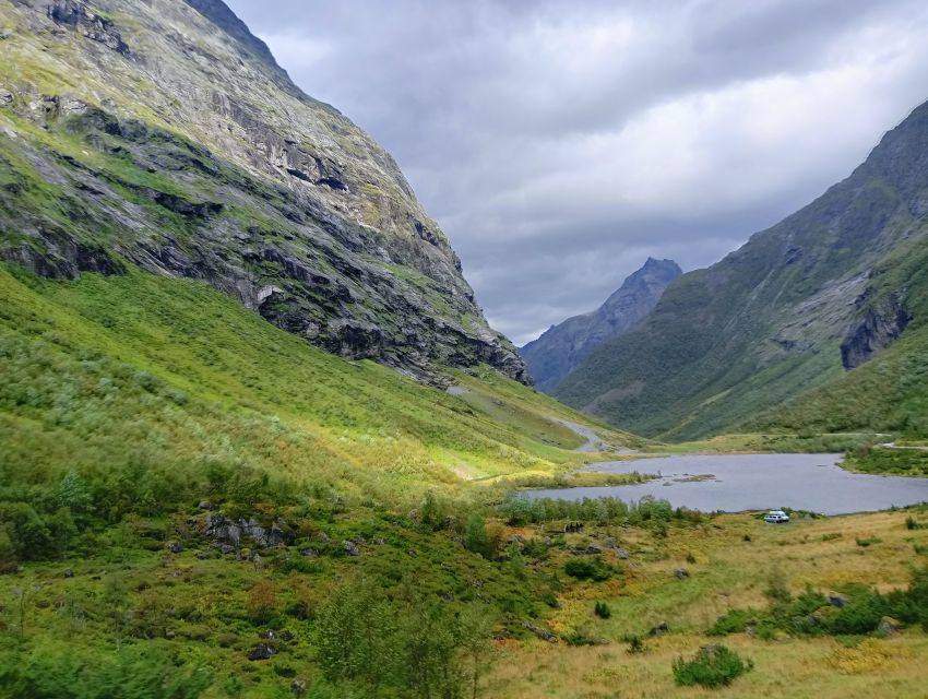 Gegen 11:45 Uhr kommt schließlich ein Bus mit anderen Gästen von AIDAnova, die also die Bootstour von Øye zurück nach Bjørke machen. Wir stiegen ein und da sich sowieso jeder woanders hinsetzte als am Morgen, nahm ich auf der rechten Seite Platz, was sich wiederum als bessere Seite herausstellen sollte, wie ich während unserer Fahrt durch das nur wenige Kilometer hinter Øye beginnende Norangsdalen feststellen sollte.