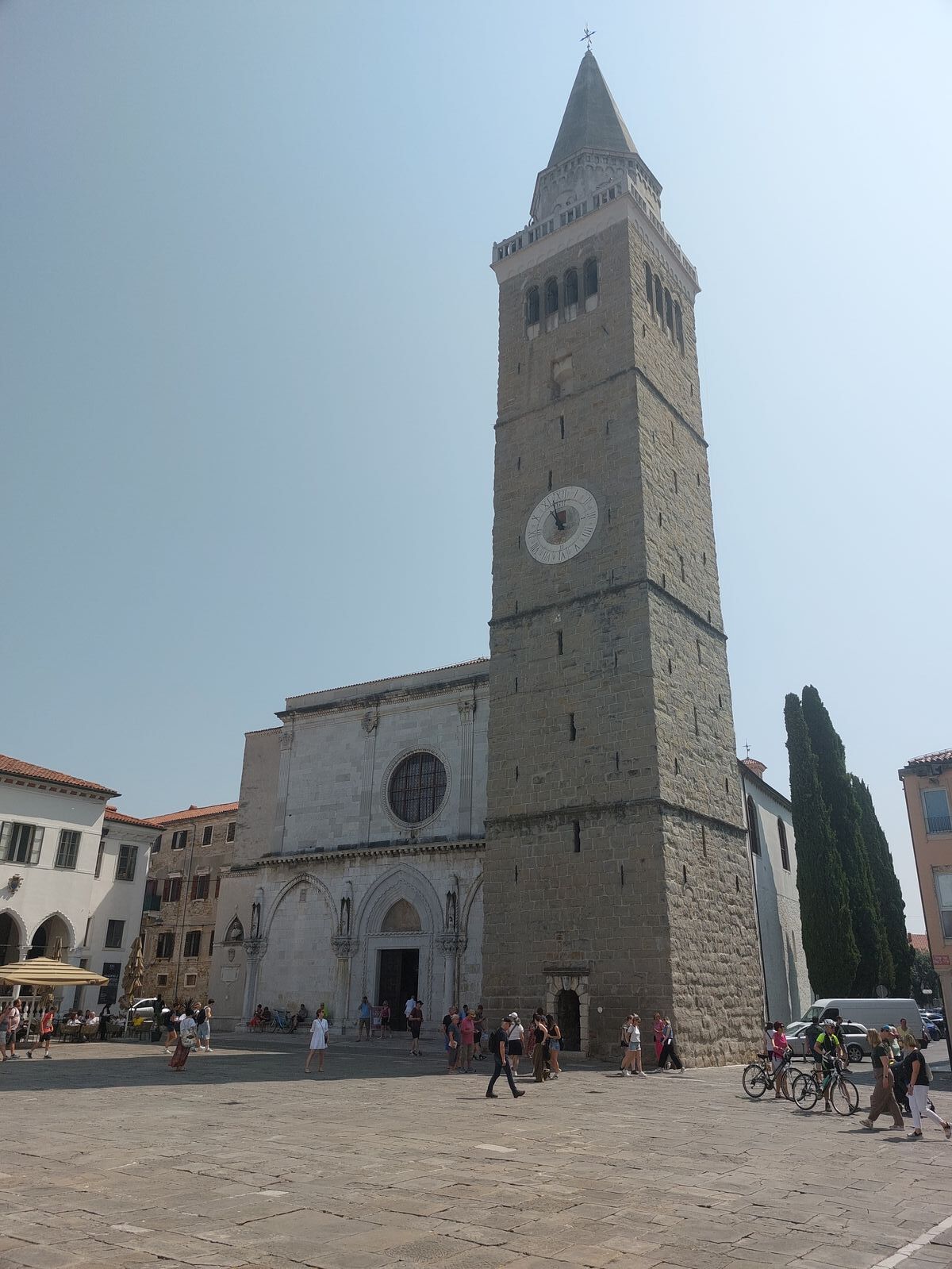 Dann sind wir durch die Gassen zum zentralen Platz Titov trg gelaufen, wo wir auf den Glockenturm gestiegen sind welcher 5,00 EUR Eintritt kostet. Von oben hat man einen tollen Blick über die Stadt und die Triester Bucht. Auch die Kathedrale ist wunderschön. Alle Sehenswürdigkeiten liegen auf engstem Raum. Rechts an der Kathedrale vorbei und wieder schräg rechts hinten haben wir noch in einer Bar im Schatten der Bäume mit den Einheimischen einen Kaffee getrunken.