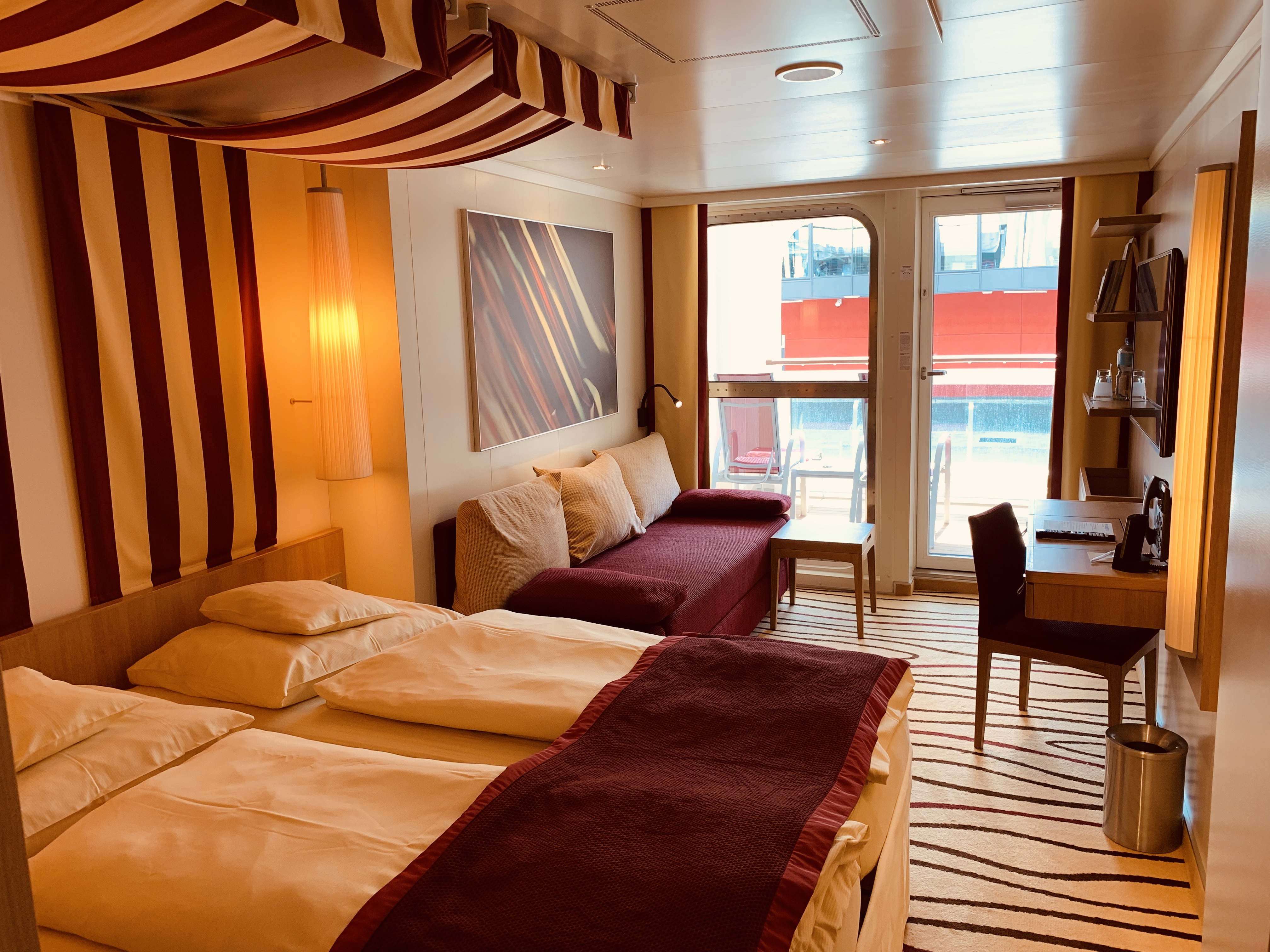 Wir haben auf der Metropolen Tour die Veranda Komfort Kabine bis zu 3 Personen (begehbare Kleiderschrank) auf der Perla gehabt.