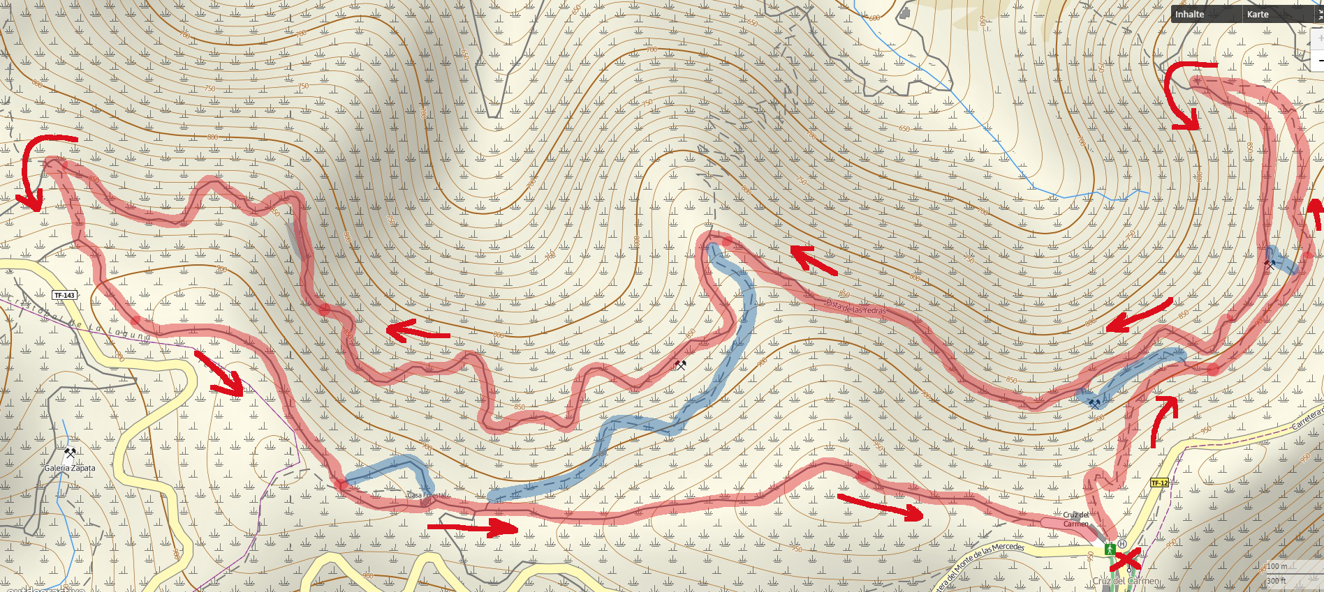Rot war der geplante Weg, blau sind mögliche Abkürzungen. Wir haben die längere blaue Abkürzung in der Mitte gewählt.