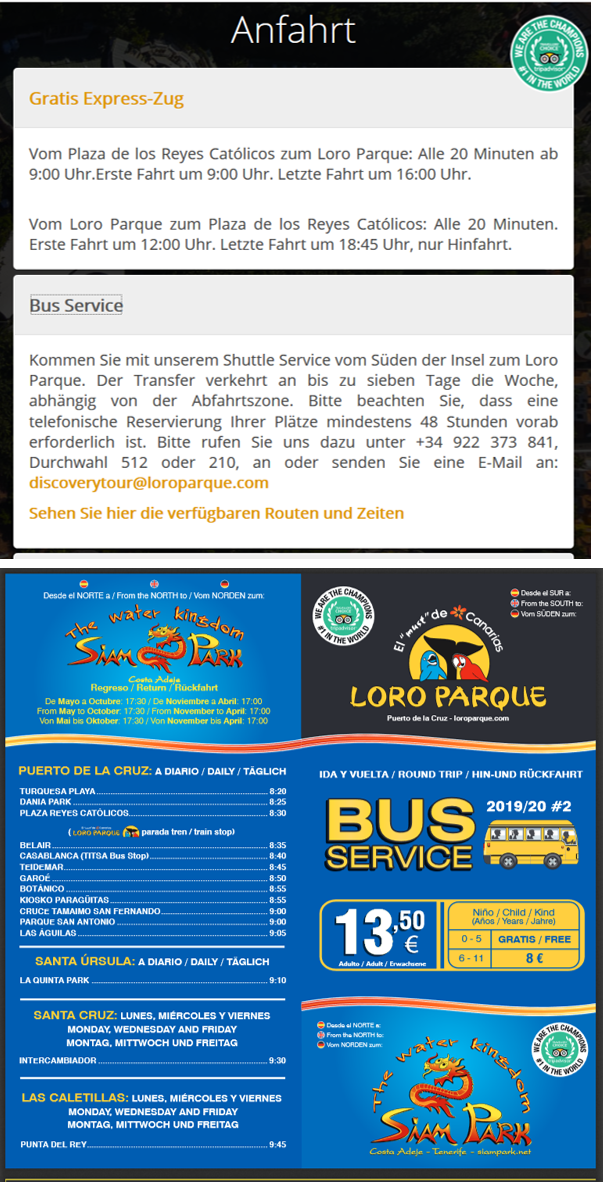 Der Preis beträgt 13,50 € pro Erwachsenen, die Reise zum Loro Parque dauert etwa 40 Minuten <<