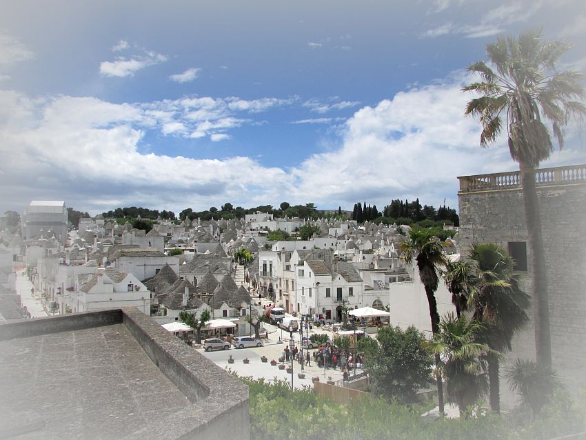 Von einer Aussichtsterrasse, auf der nachfolgendes Foto entstand, hat man einen tollen Blick hinüber zum alten Trulli-Stadtteil von Alberobello mit seinen rund 1.000 Trullis: