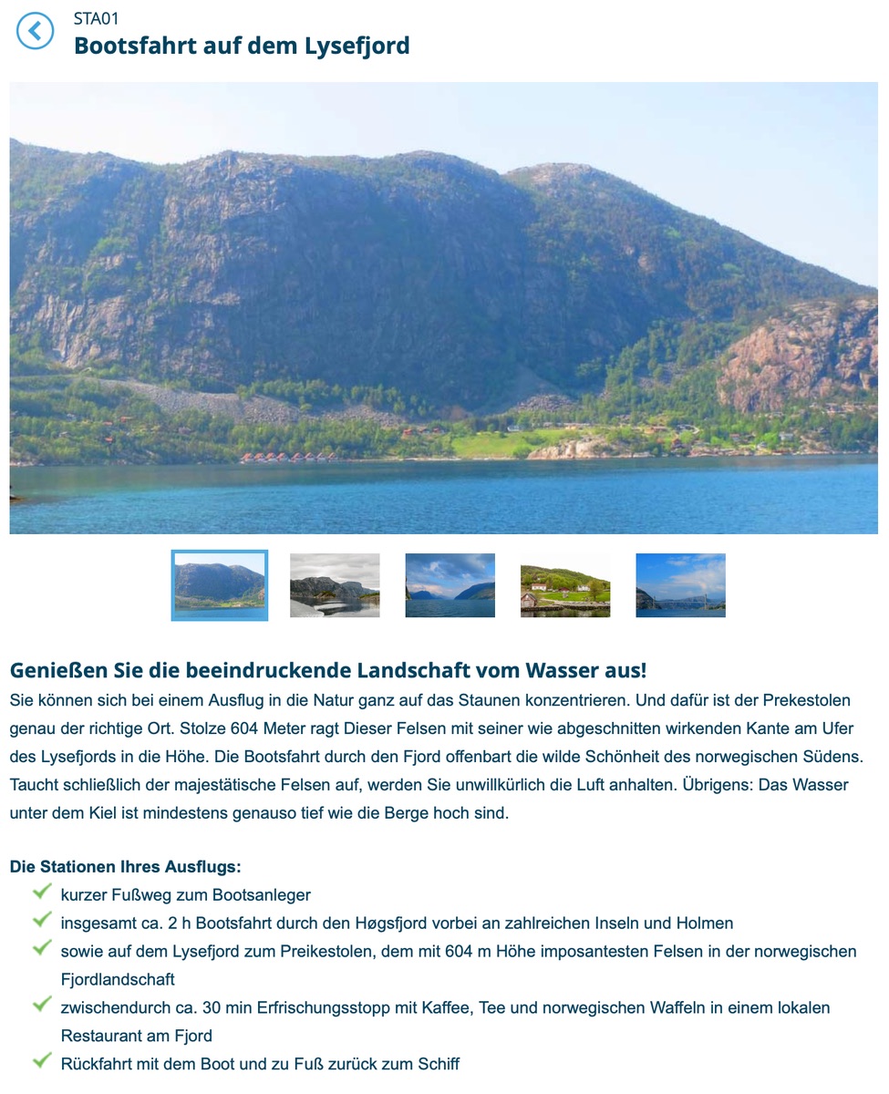 Hallo Fibiie wir haben diese Tour letztes Jahr auf unserer Norwegentour gemacht. Gbucht habe ich über Get your Guide für ca.113 Euro pro Person wesentlich billiger als über Aida und mehr Sehenswürdigkeiten. Alles gut geklappt super Leute fie Dich empfangen und alles erklären
