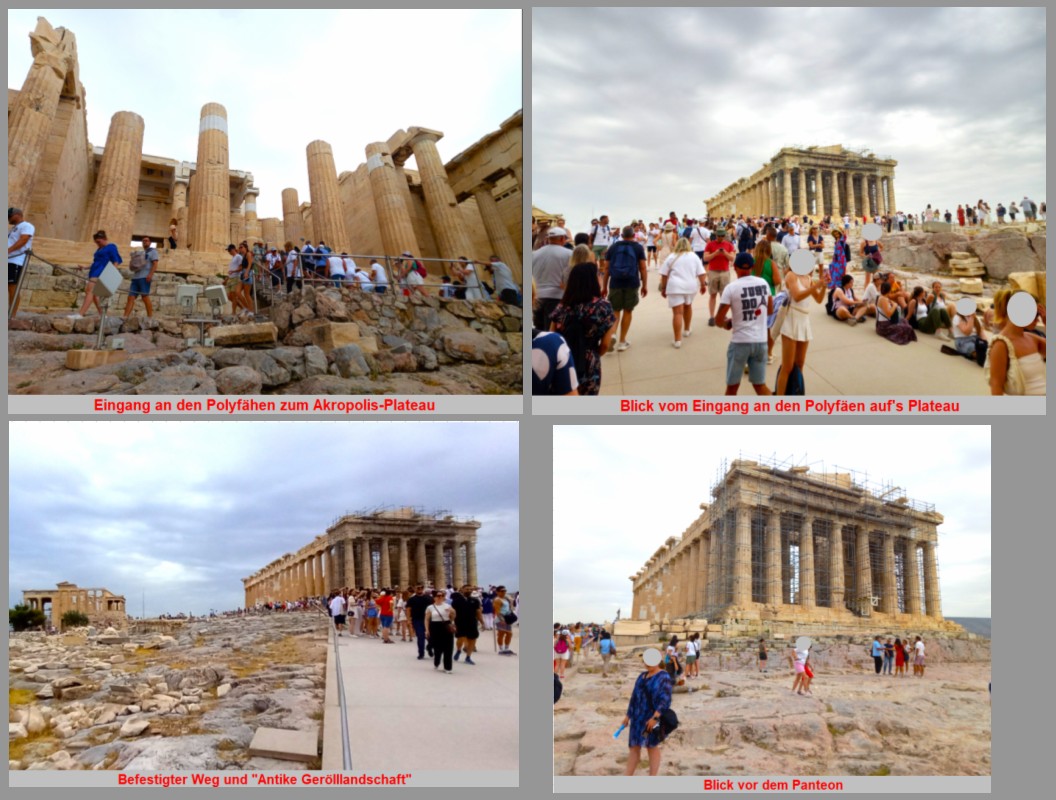 Auf dem Plateau selbst gibt es befestigte Wege zwischen Polyfäen, Nike-Tempel Pantheon, Erechtheion etc. ansonsten besteht das Plateau aus einer "Antiken Gerölllandschaft", die nur beschwerlich durchlaufen werden kann.