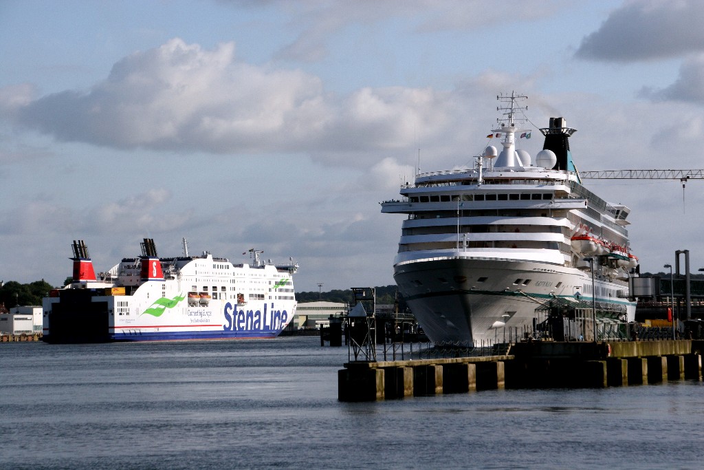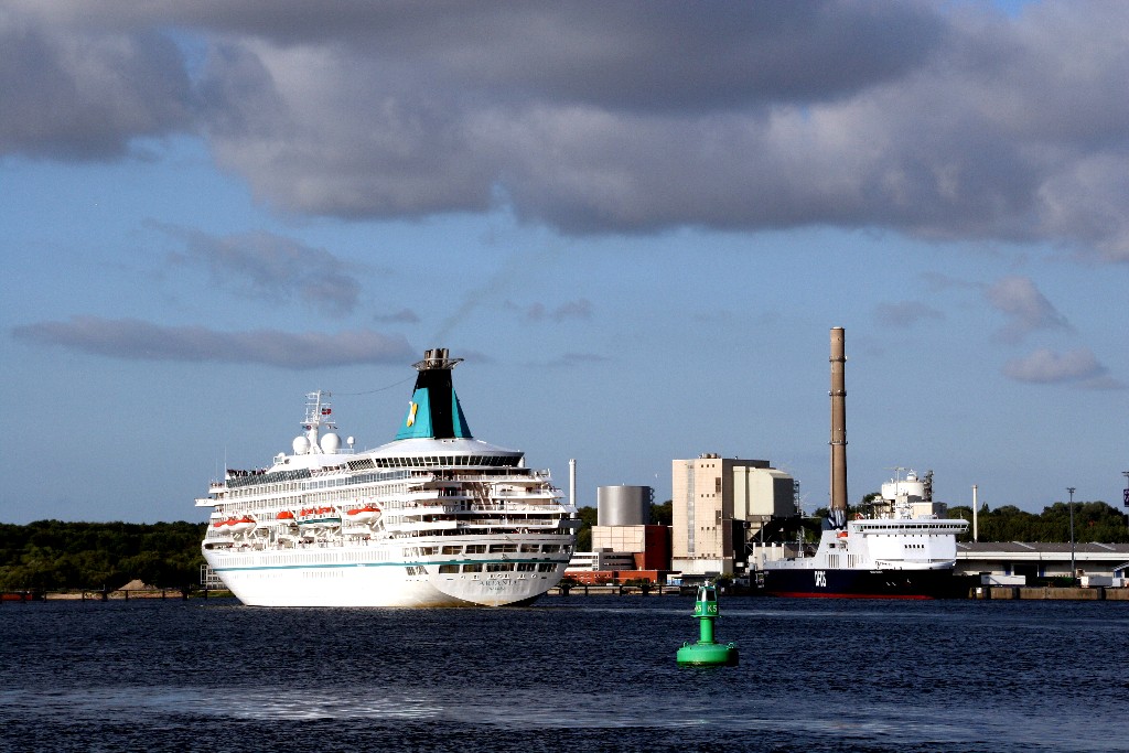 Die "Artania" muß noch auf das Auslaufmanöver der "Stena Scandinavica" warten