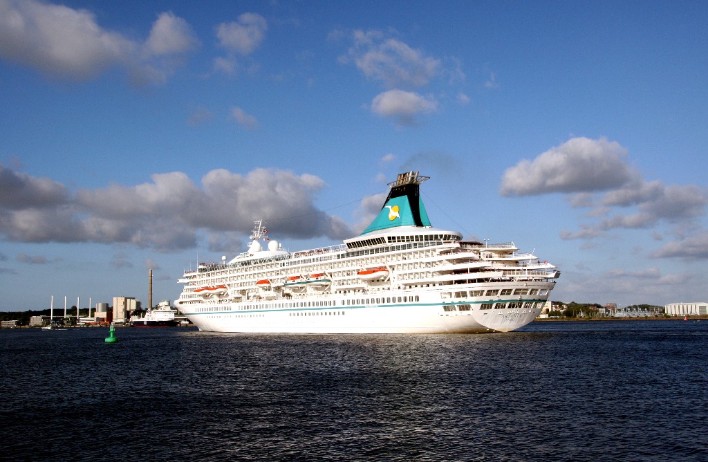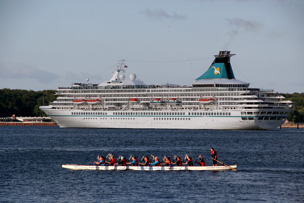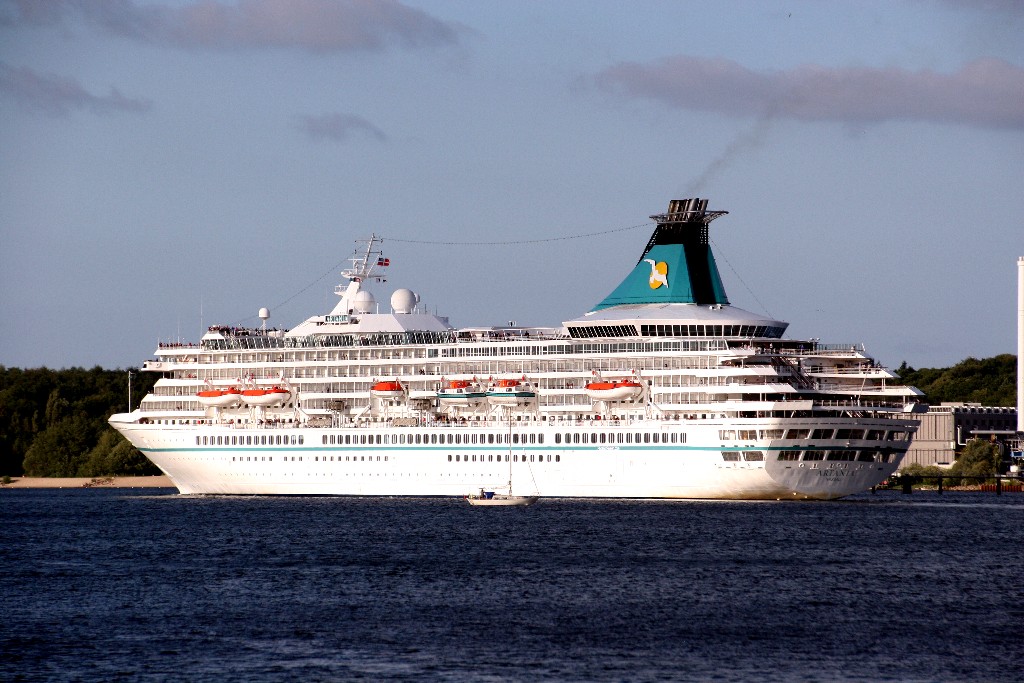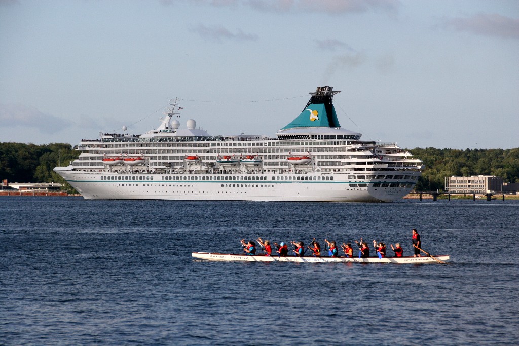 Die "Artania" fährt um 19:09h ihr Auslaufmanöver auf der "Kieler Förde"