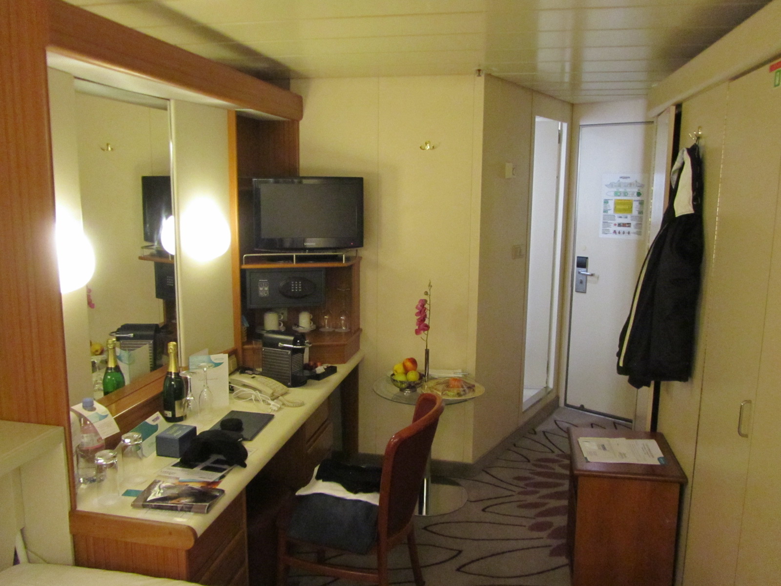 Der Vorteil der Kabine ist, dass sie gleich neben einem der beiden Waschsalons an Bord liegt. So muss man nicht erst weite Wege mit der Schmutzwäsche zurücklegen, um zu schauen, ob eine Waschmaschine frei ist, Der Nachteil dabei kann aber für einige sein, dass die Tür des Waschsalons oft offen ist und man dann das Gefühl hat, dass nebenan ein Flughafen ist.