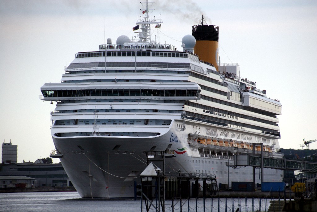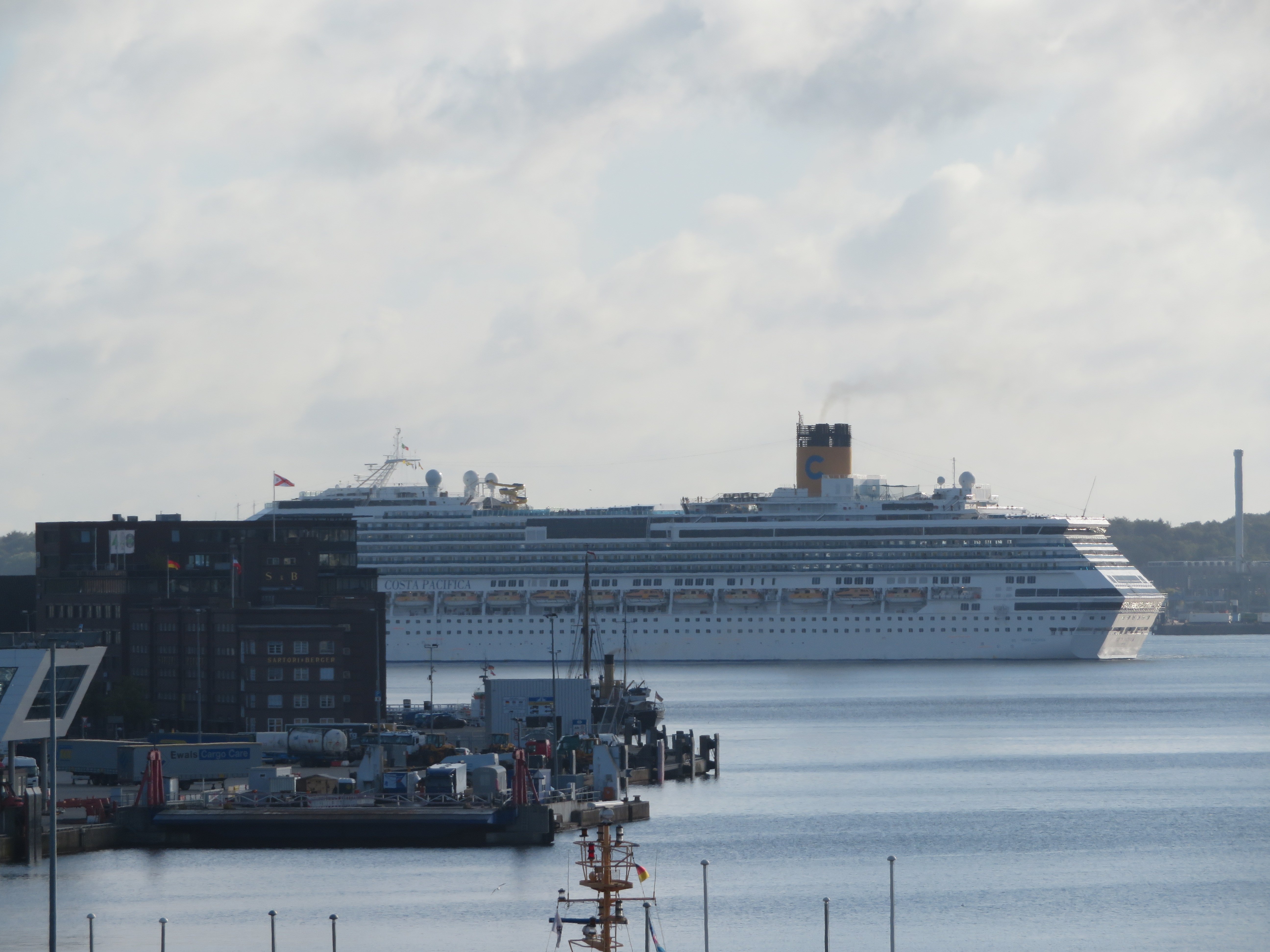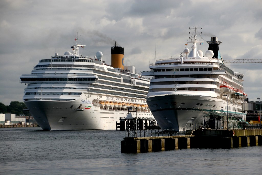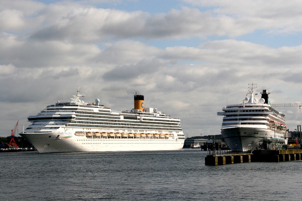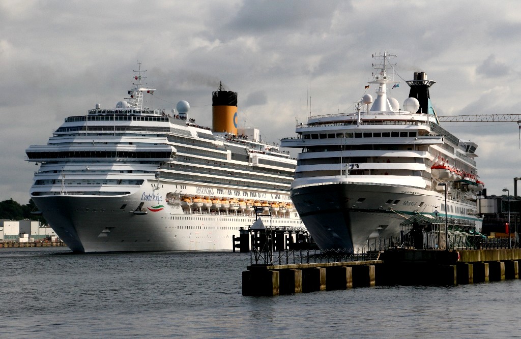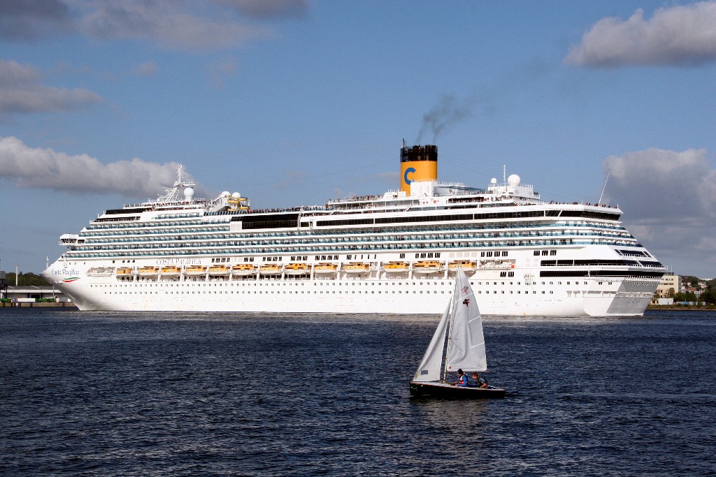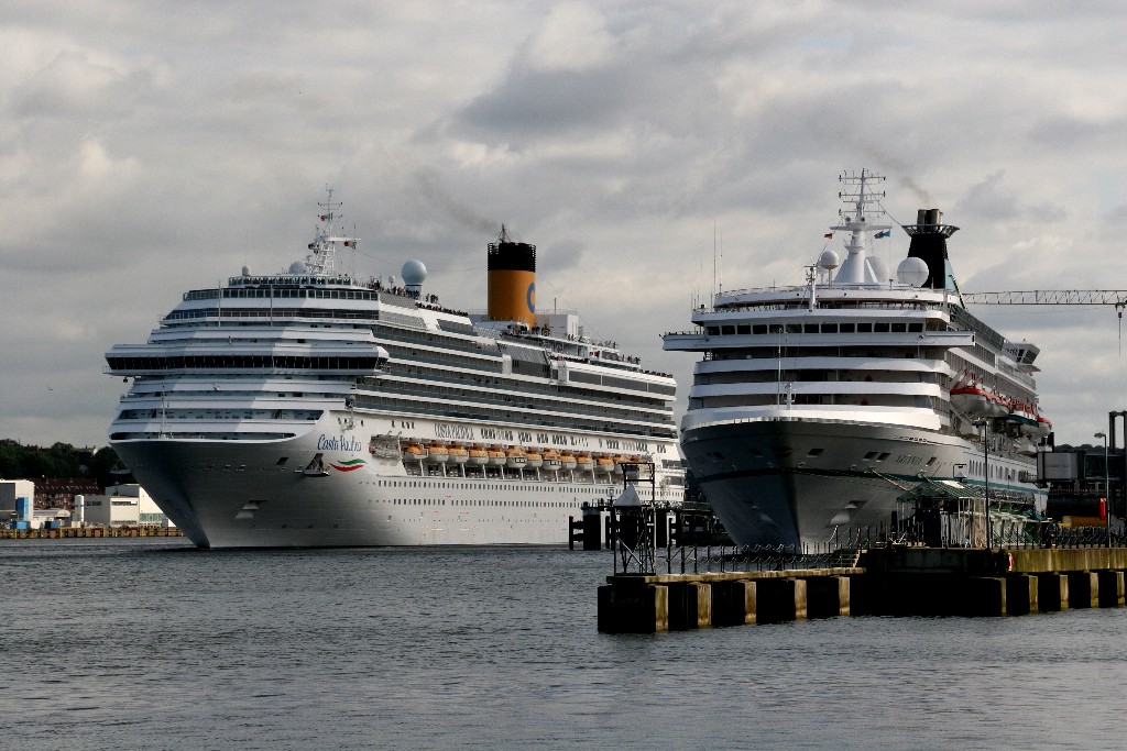 Die "Costa Pacifica" wartet am Ostseekai hinter der "Artania" mit einem tiefschwarzen "Heizergruß" auf ihr Auslaufmanöver