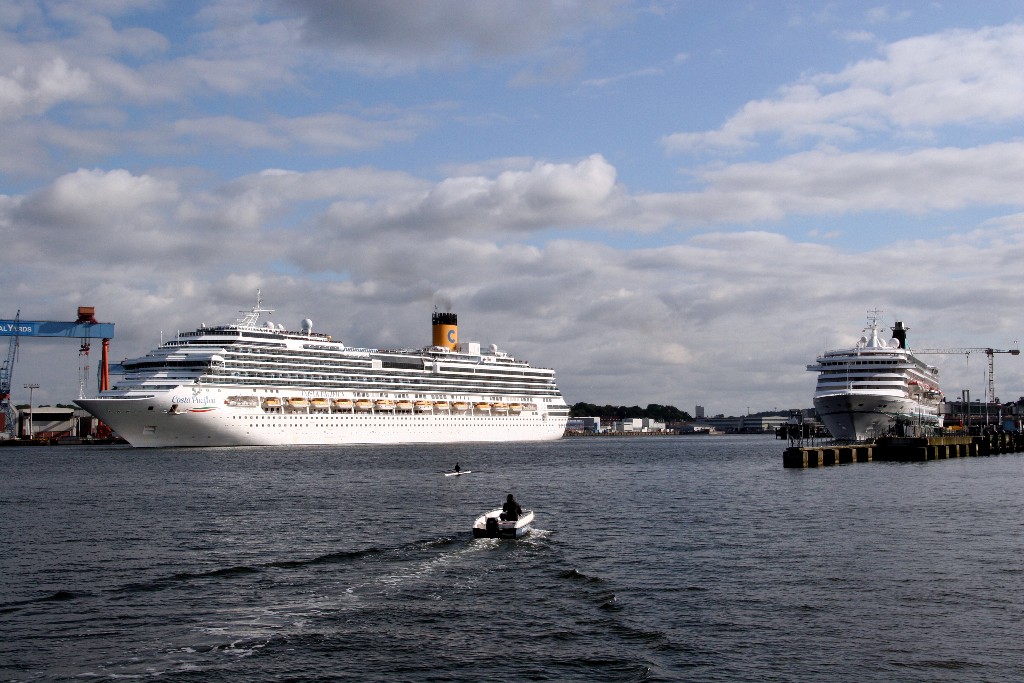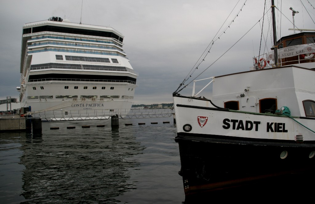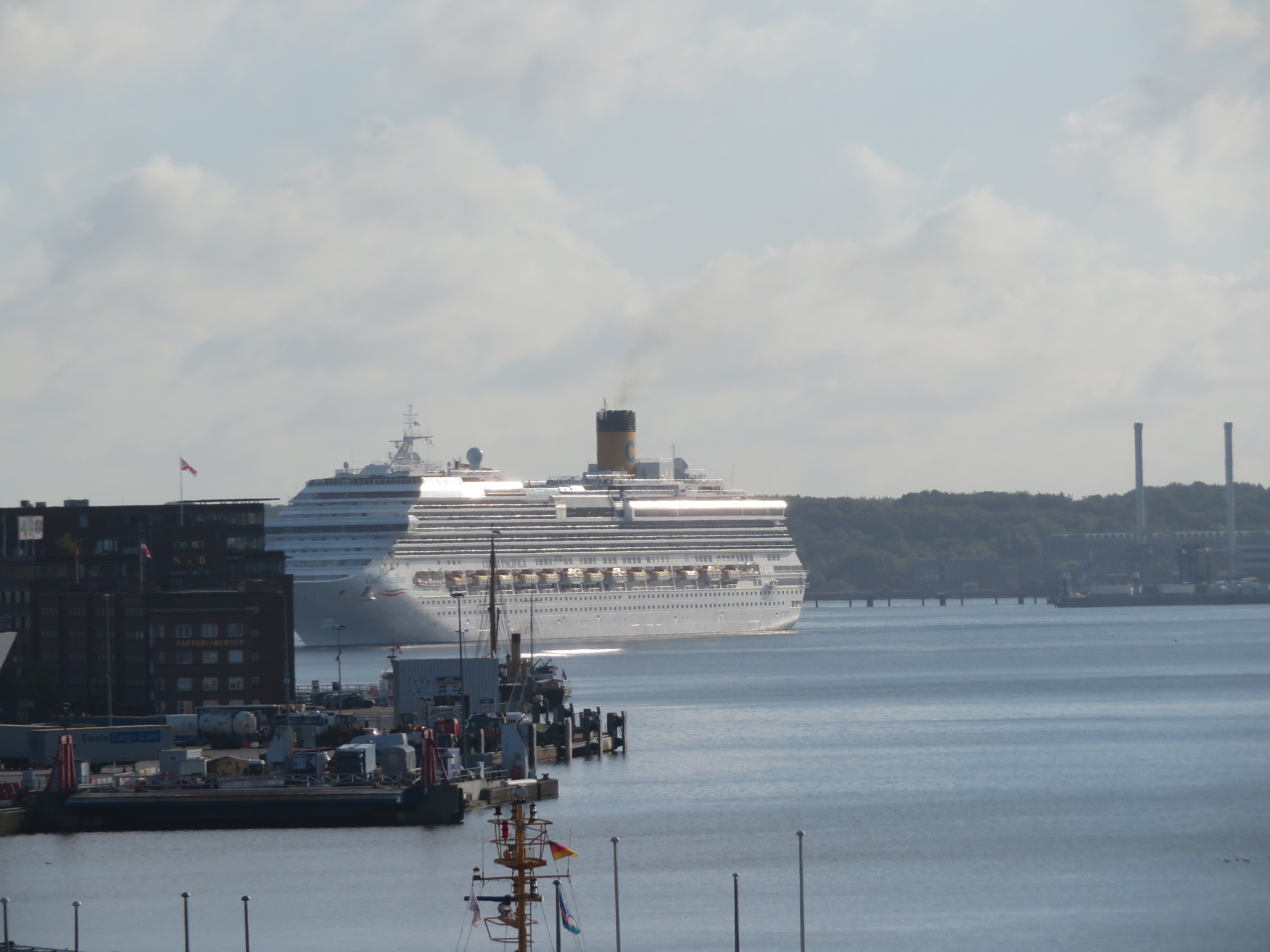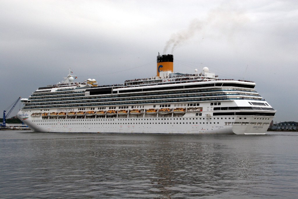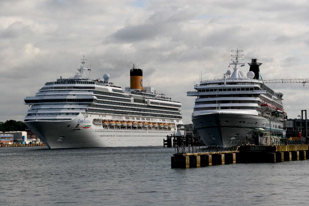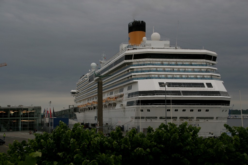 Die "Costa Pacifica" wartet am Ostseekai hinter der "Artania" mit einem tiefschwarzen "Heizergruß" auf ihr Auslaufmanöver