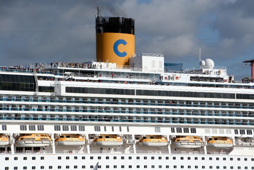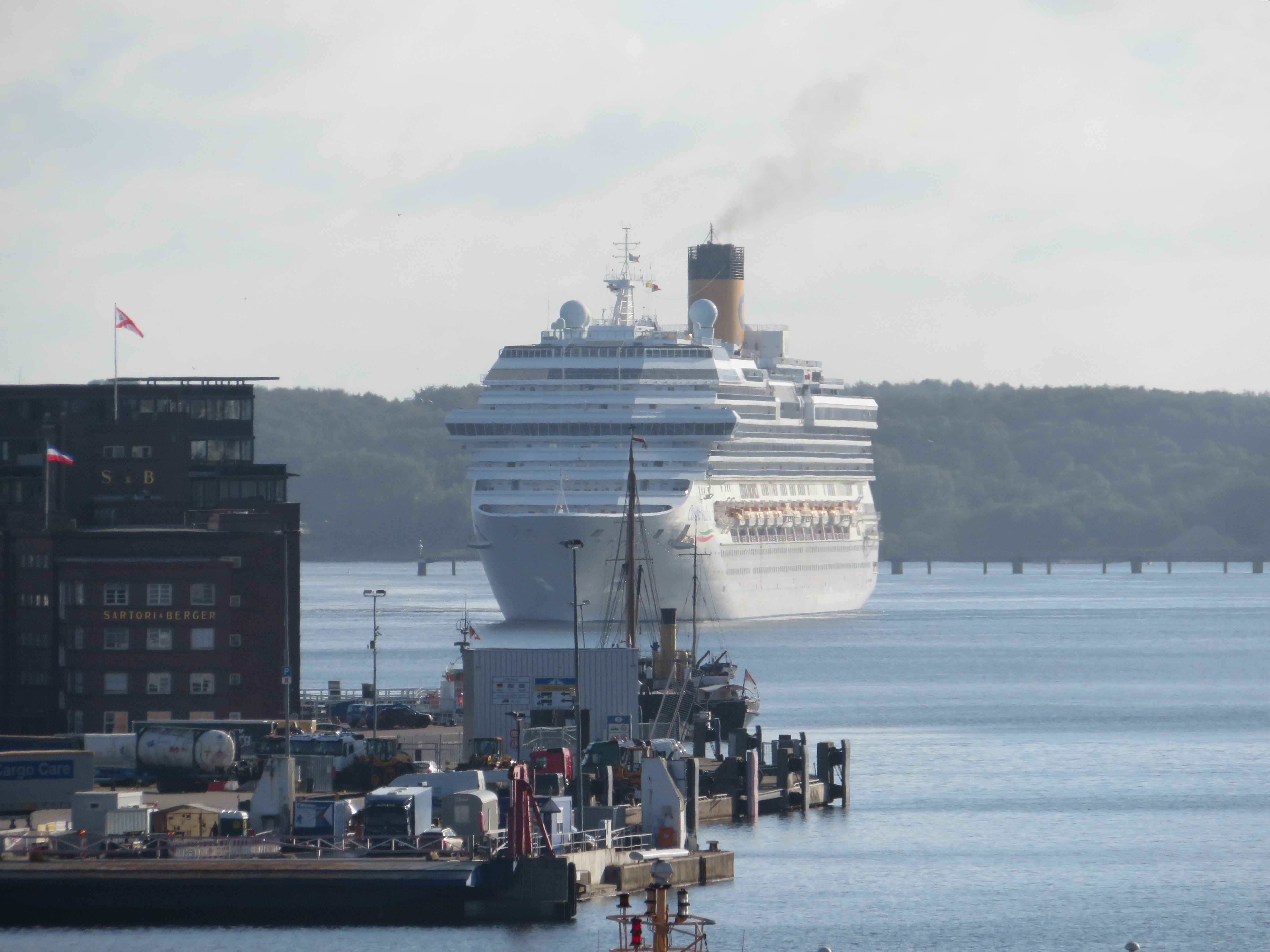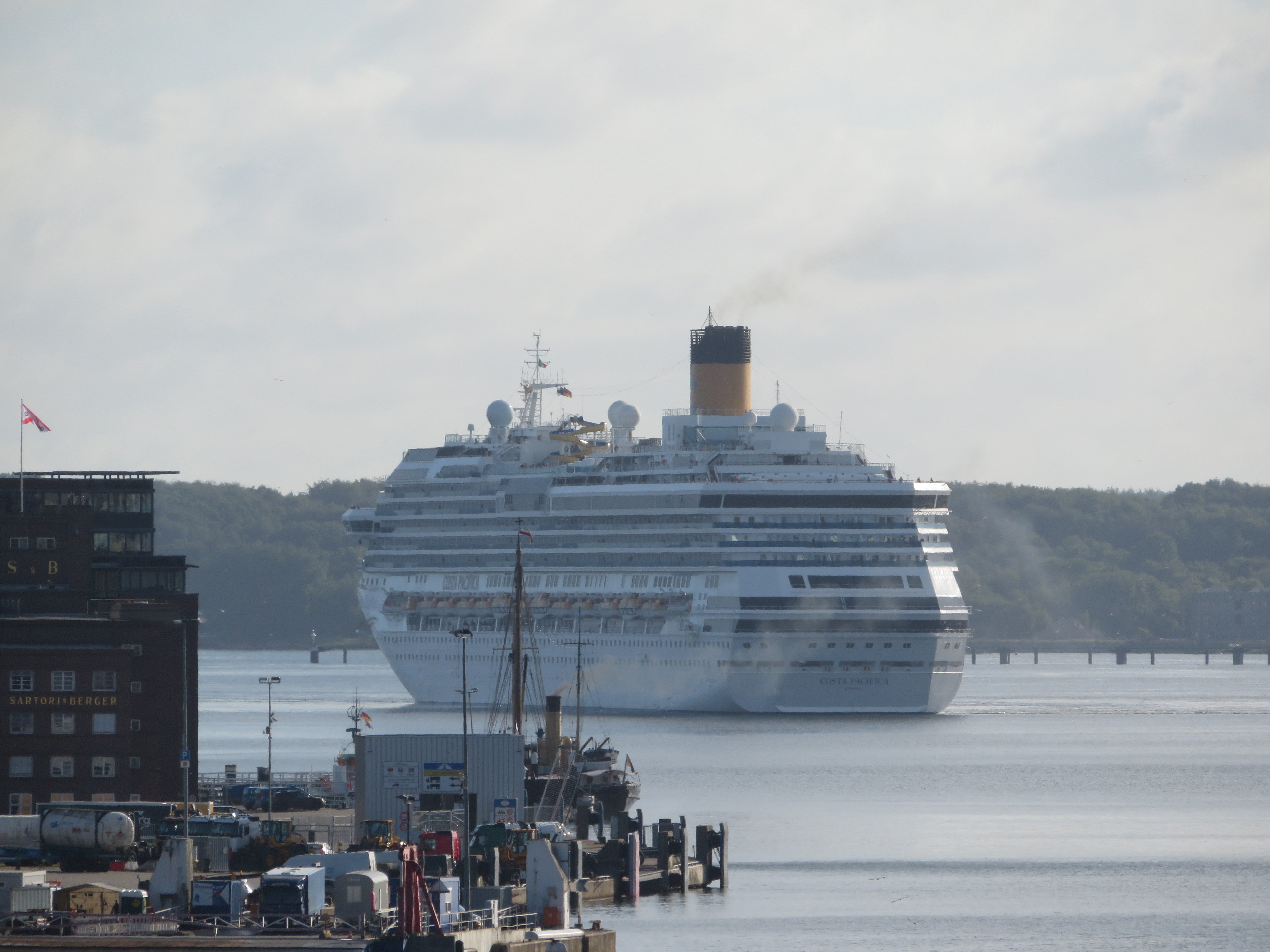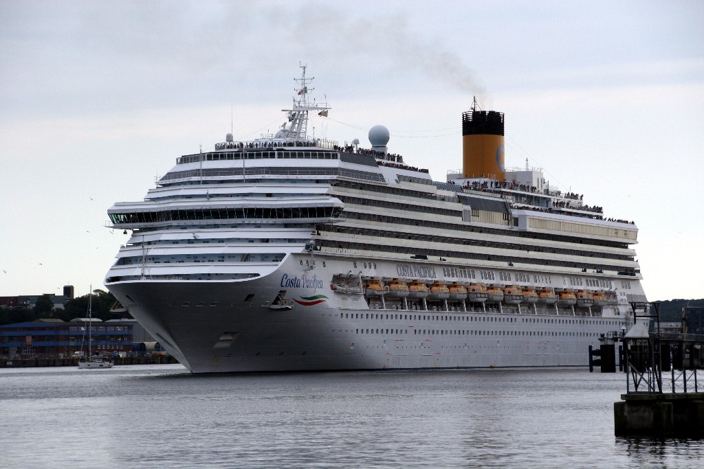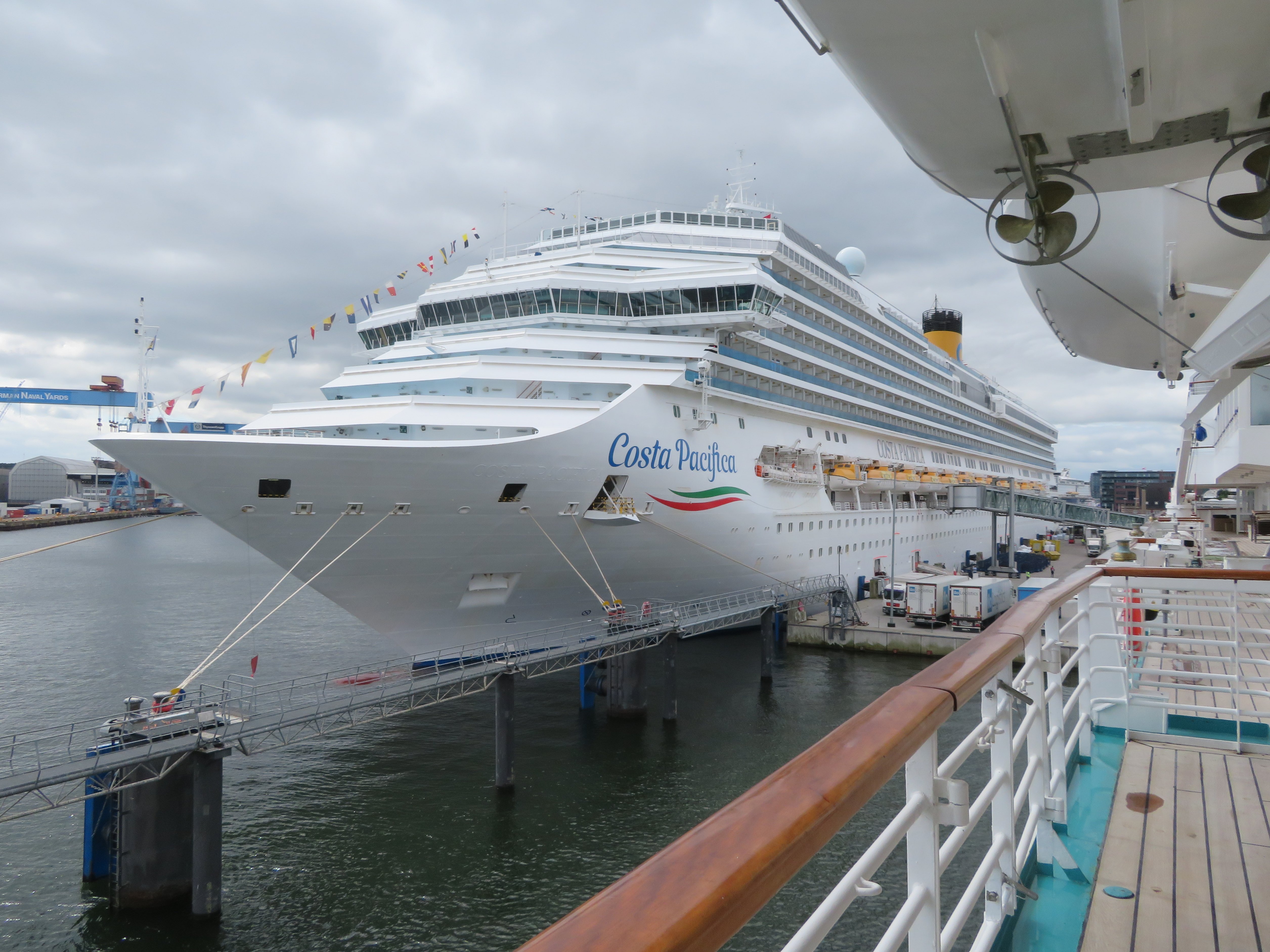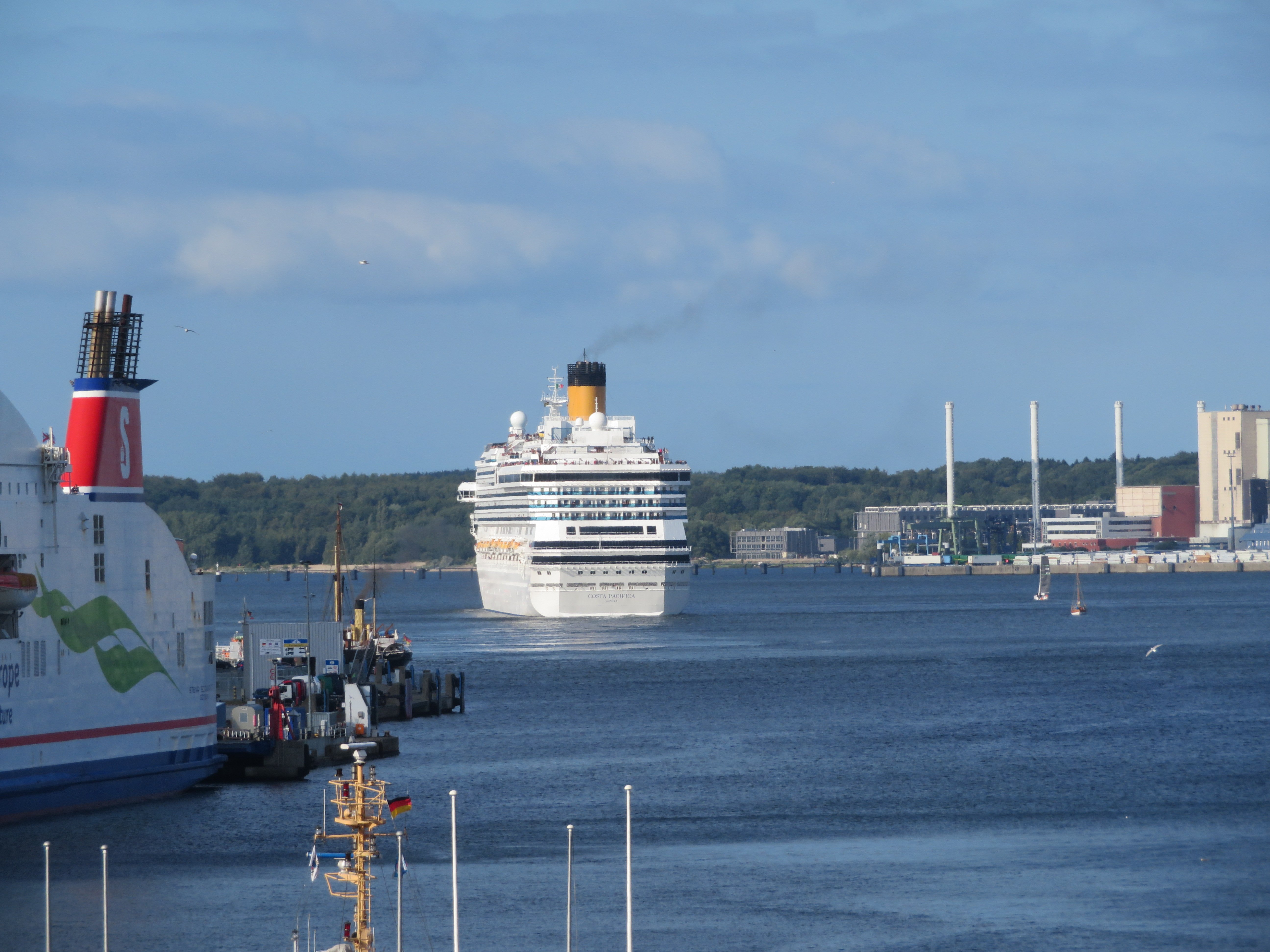 Die "Costa Pacifica" wartet am Ostseekai hinter der "Artania" mit einem tiefschwarzen "Heizergruß" auf ihr Auslaufmanöver