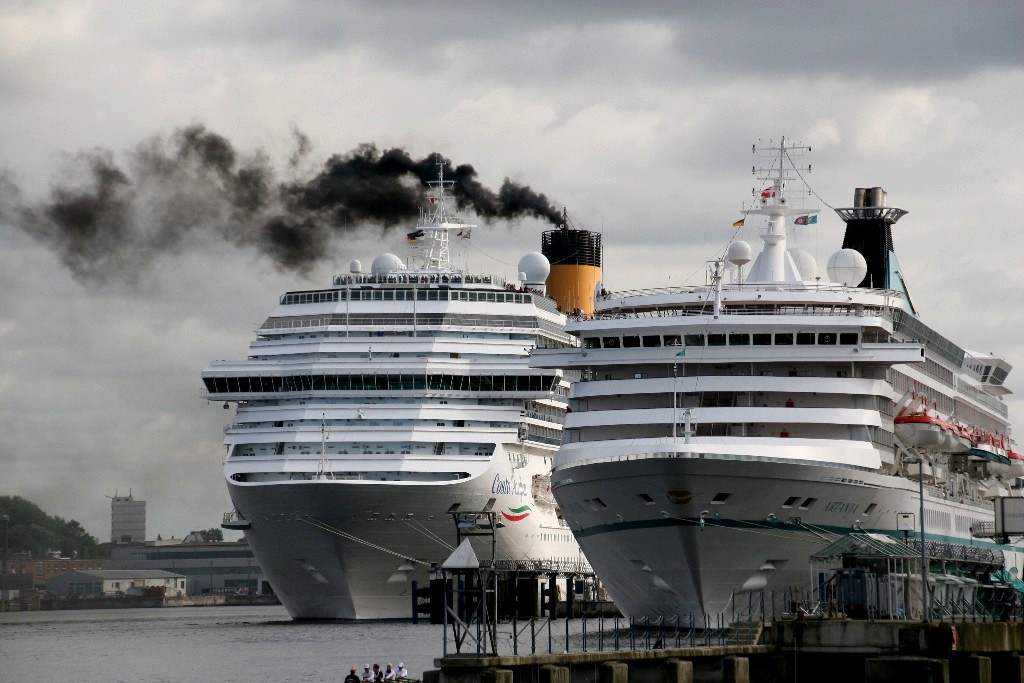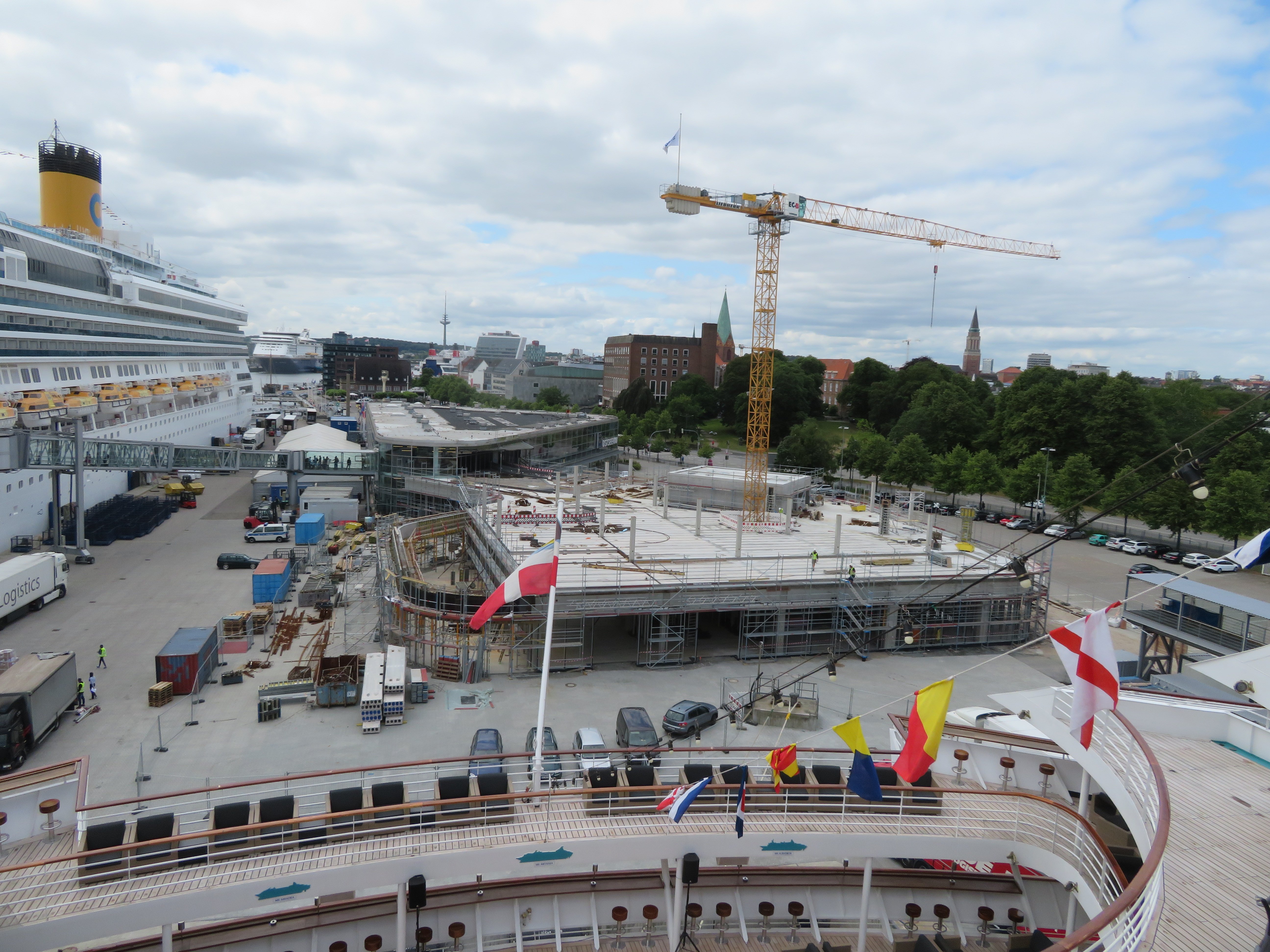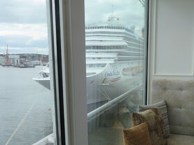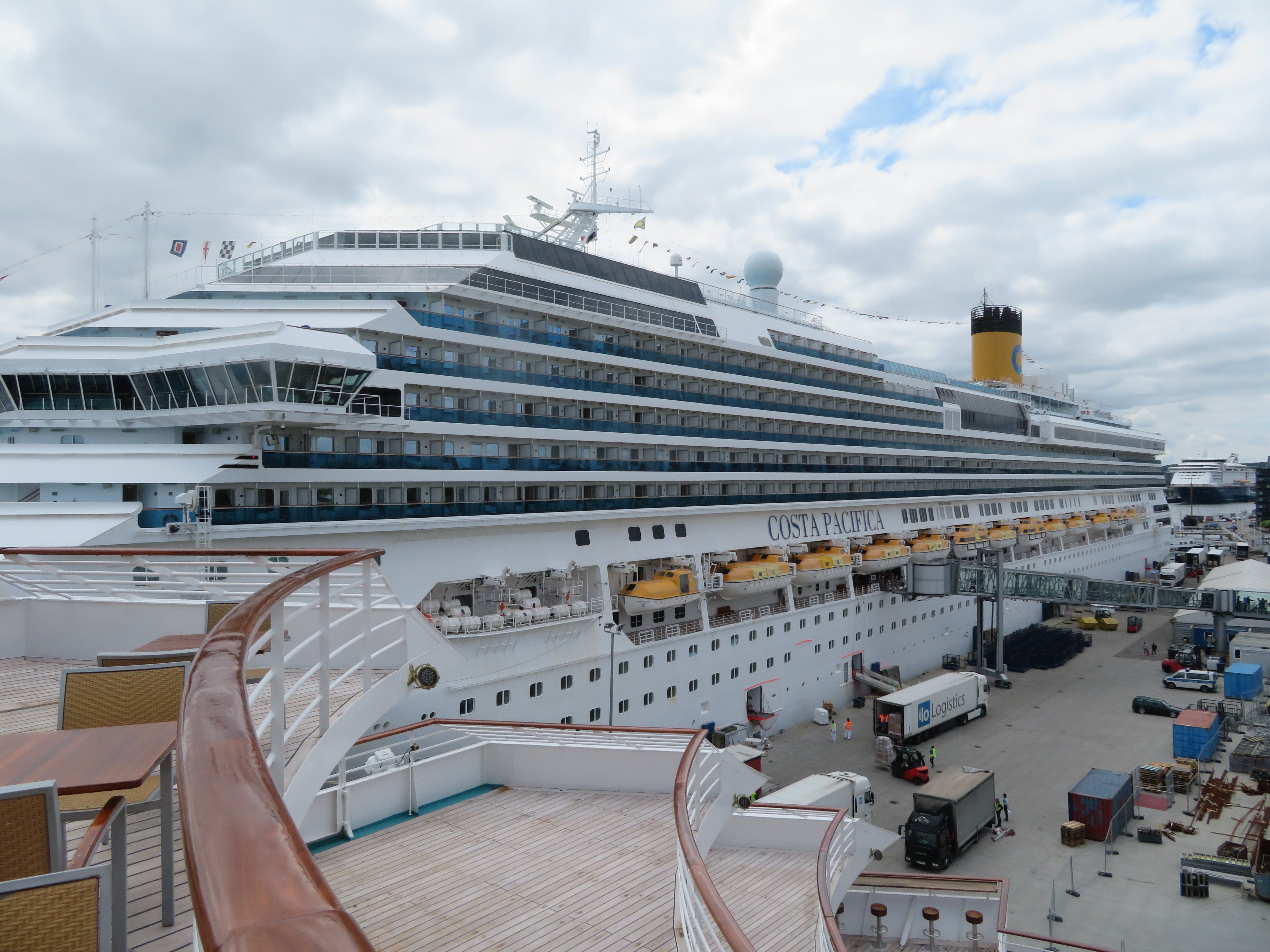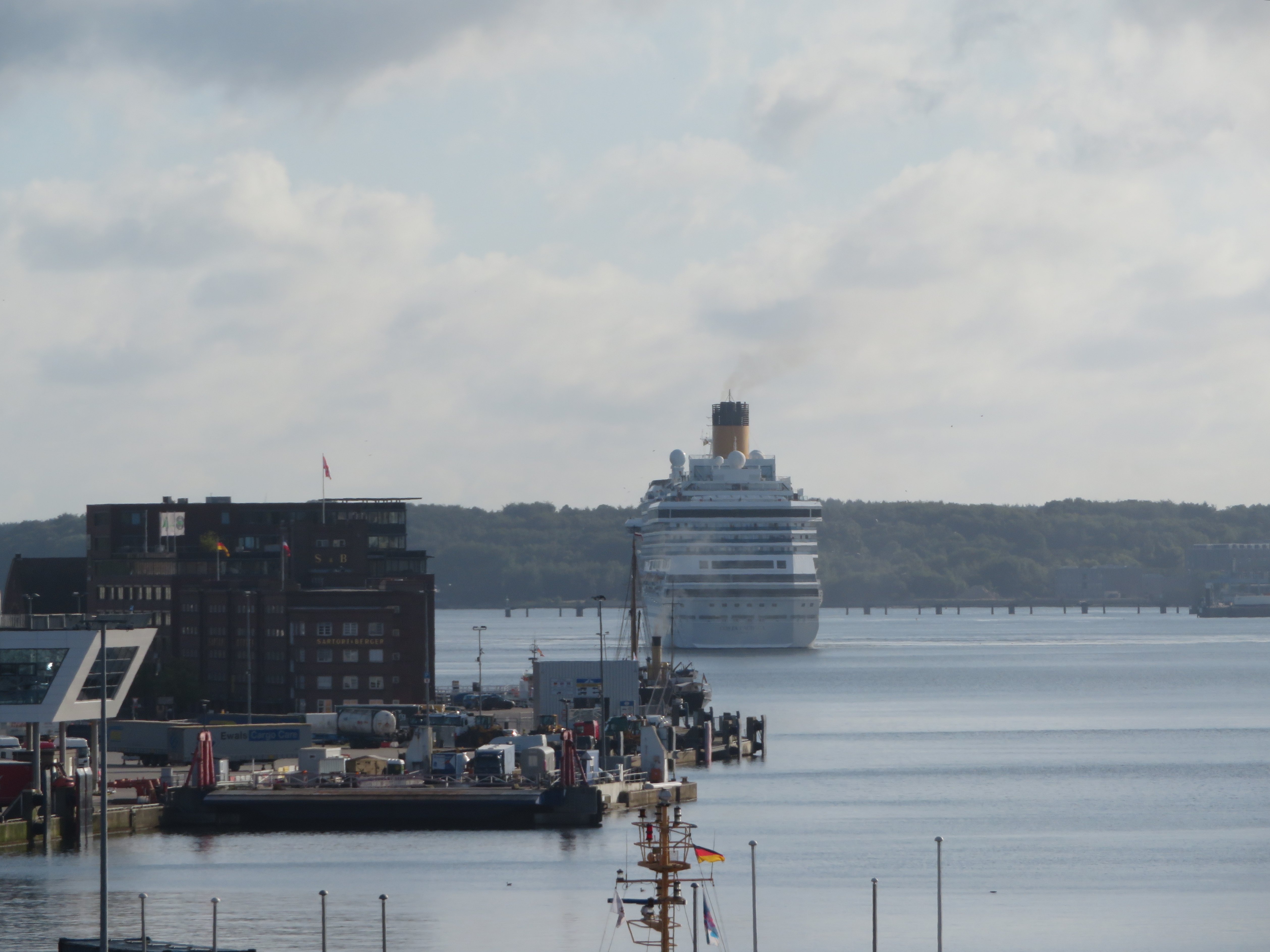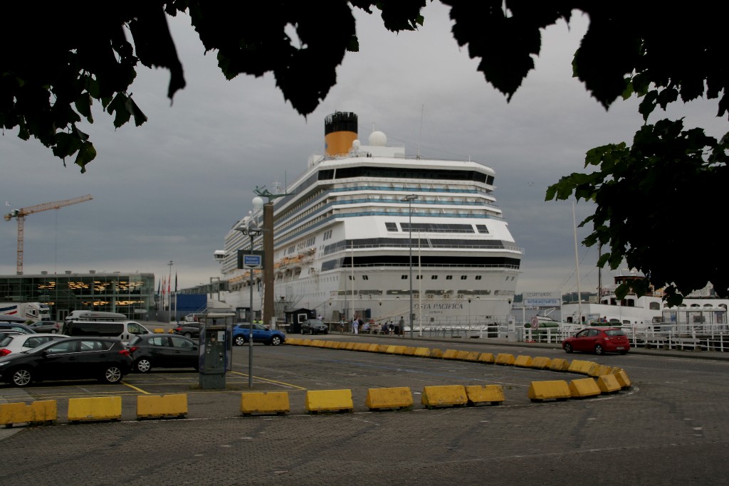 Die "Costa Pacifica" wartet am Ostseekai hinter der "Artania" mit einem tiefschwarzen "Heizergruß" auf ihr Auslaufmanöver