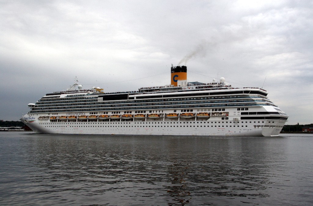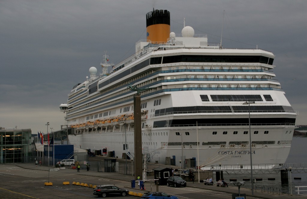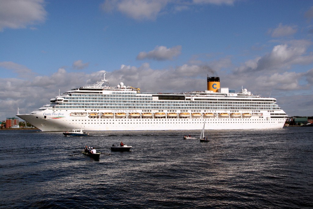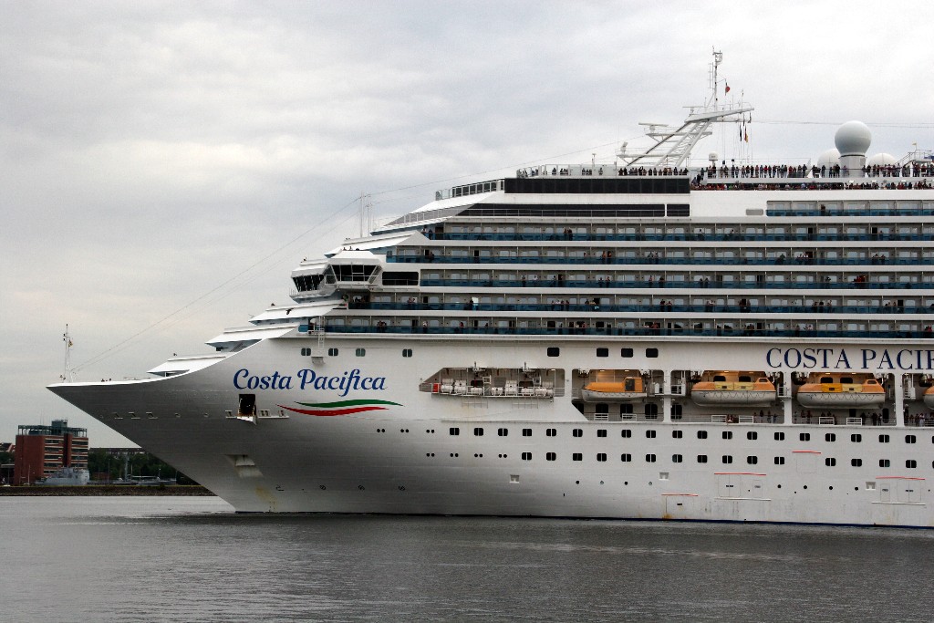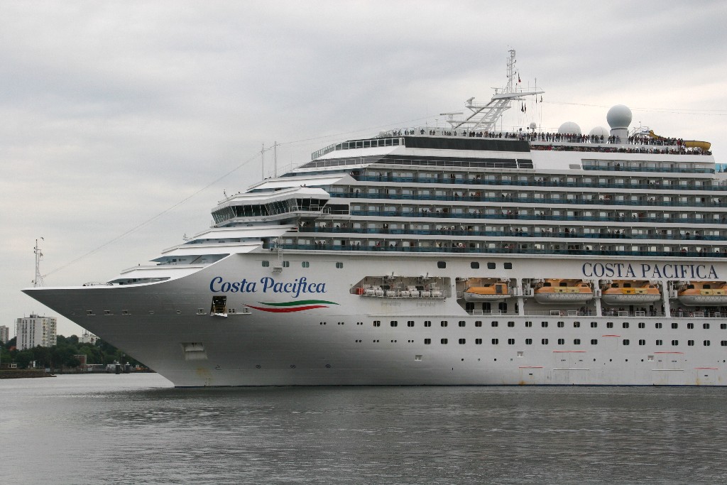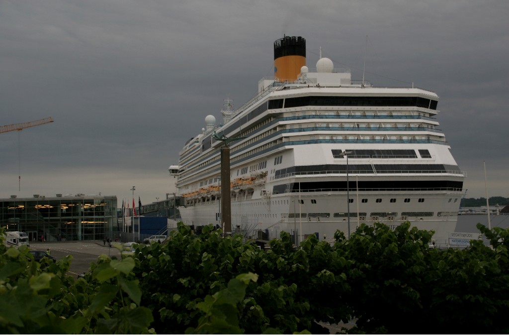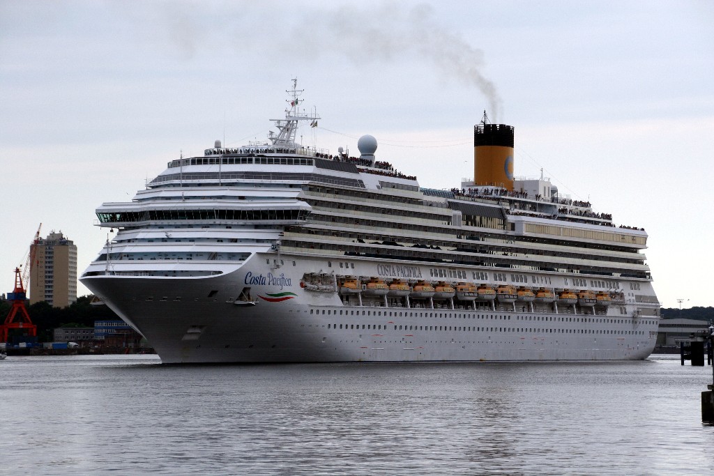 Die "Costa Pacifica" fährt ihr Auslaufmanöver in Höhe der "Artania" am Ostseekai (Liegeplatz 28)