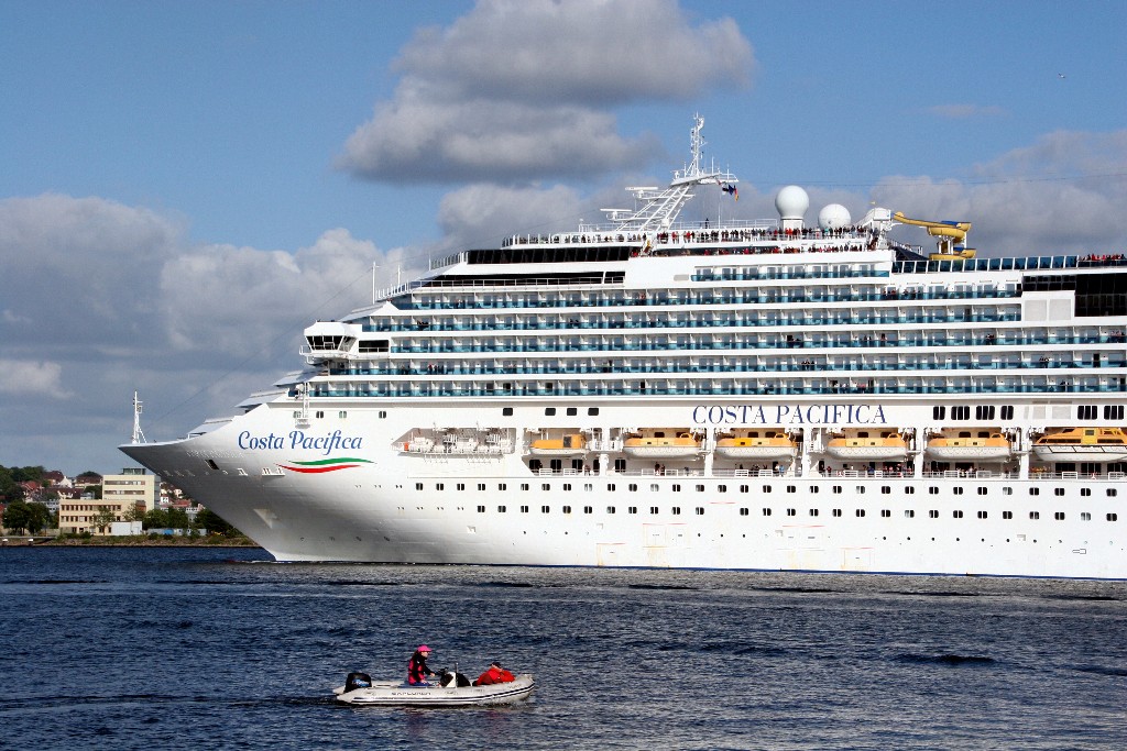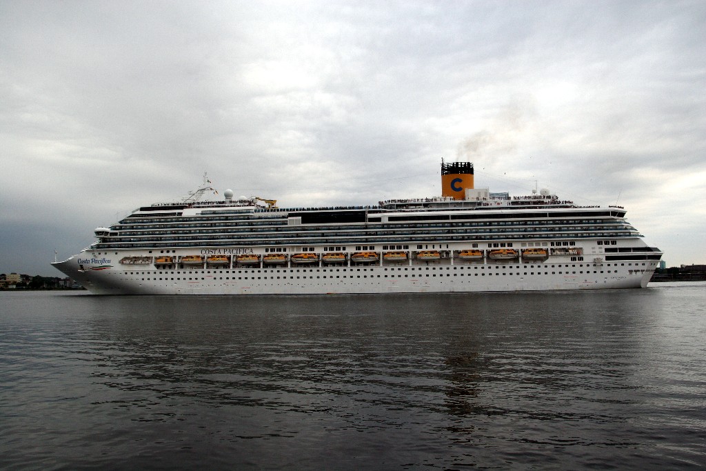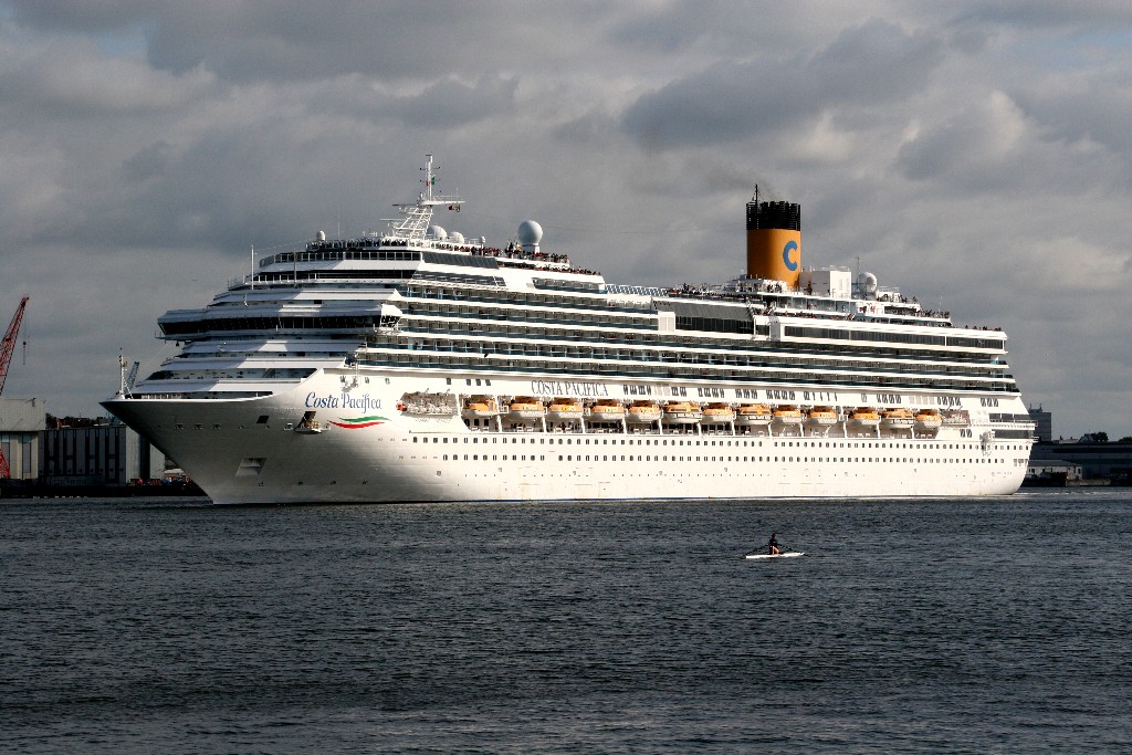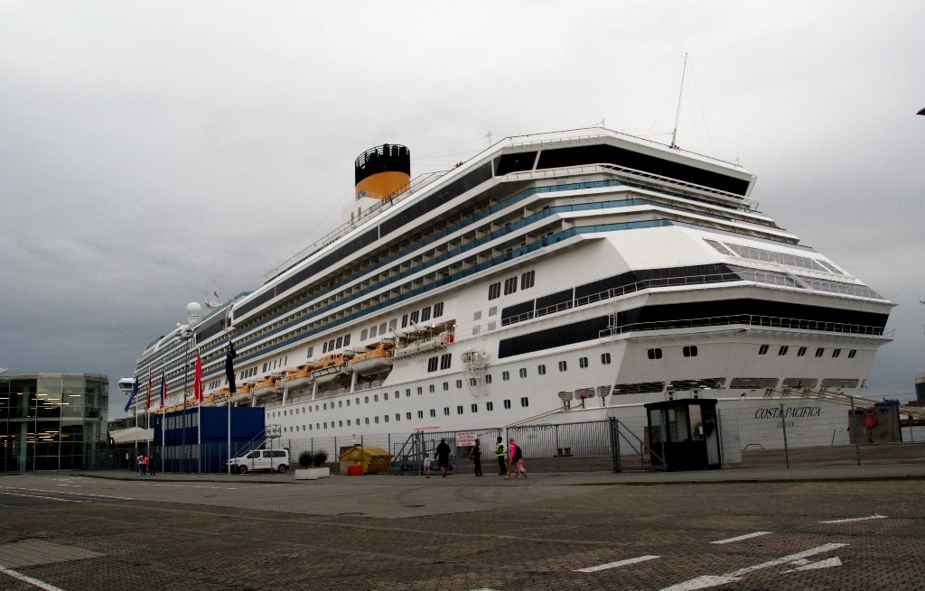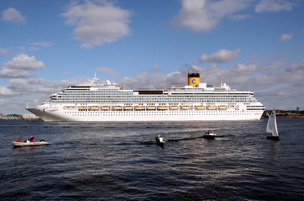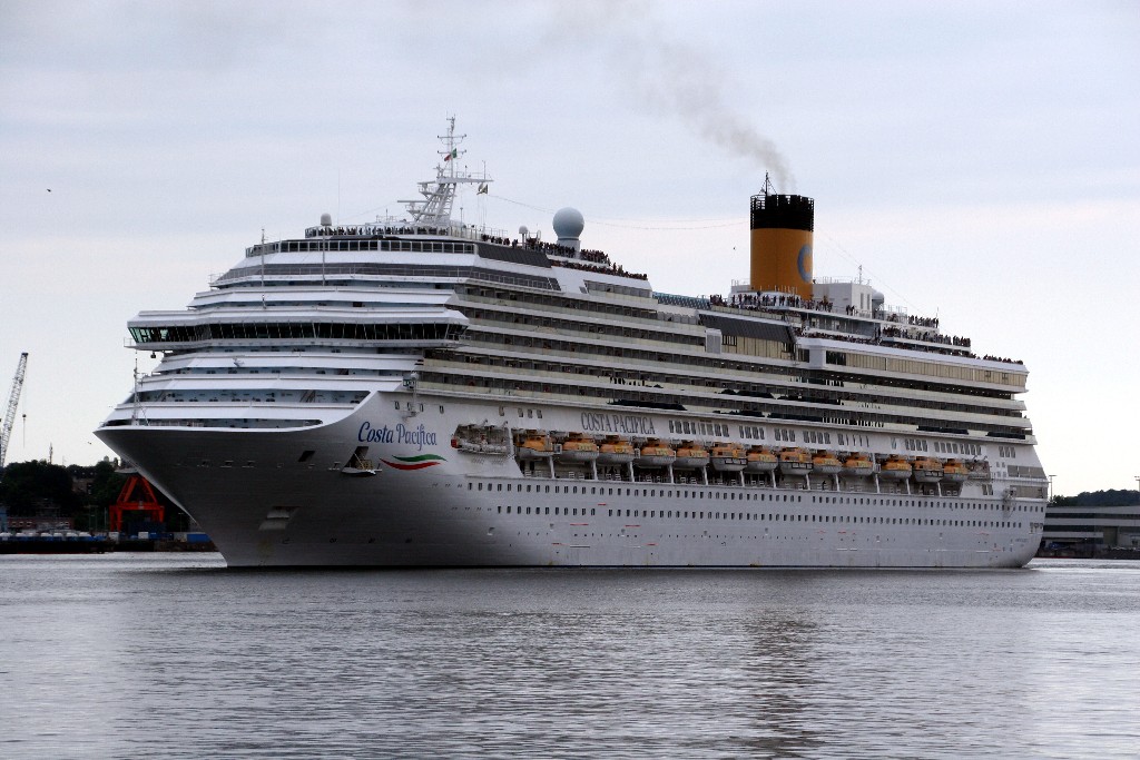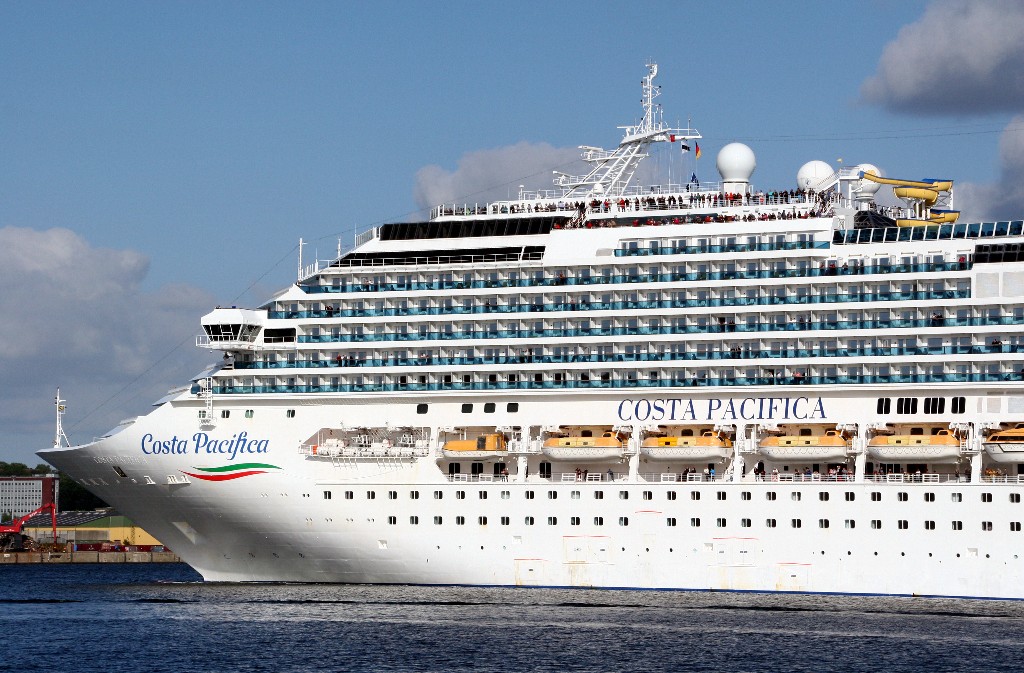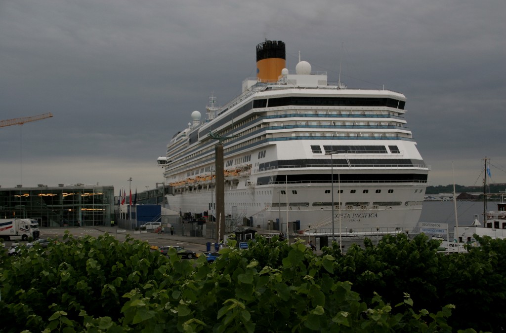 Die "Costa Pacifica" fährt ihr Auslaufmanöver in Höhe der "Artania" am Ostseekai (Liegeplatz 28)