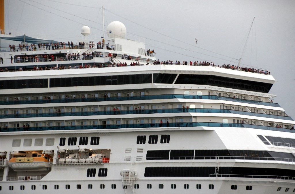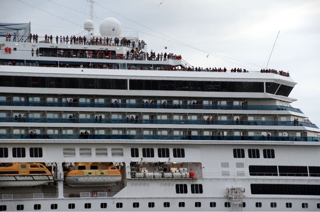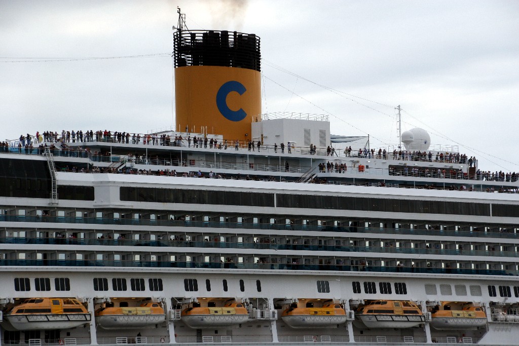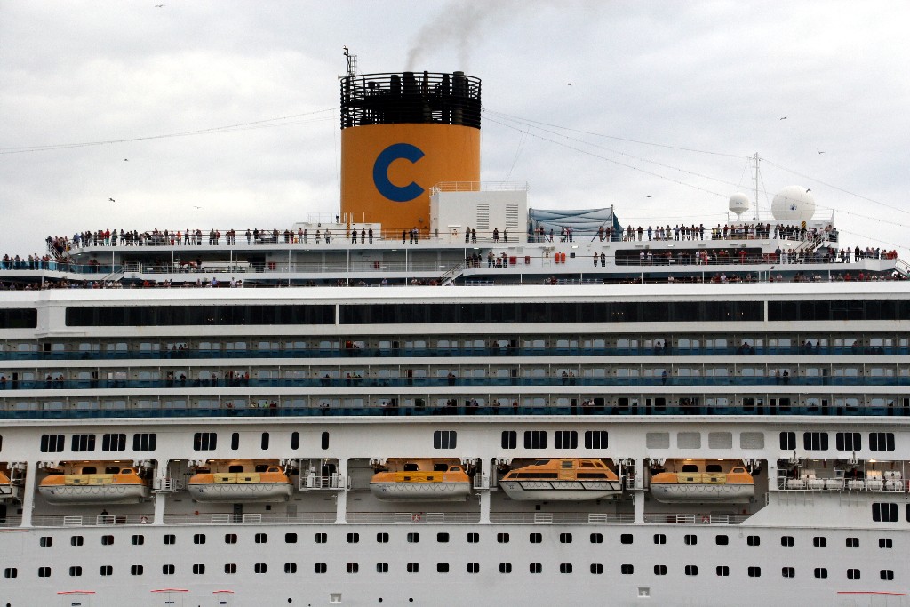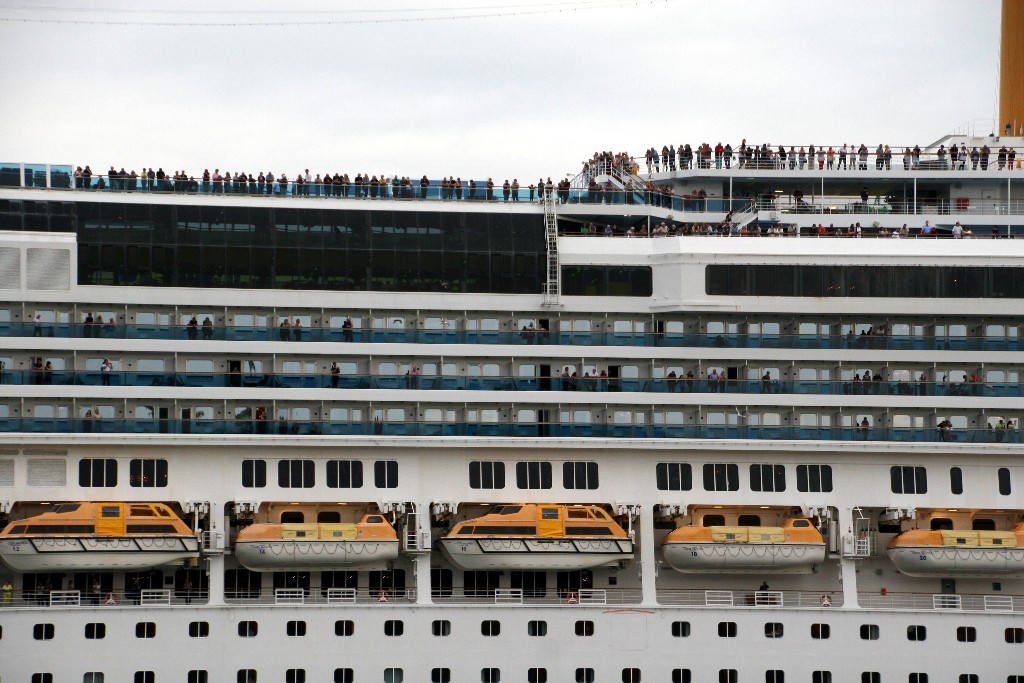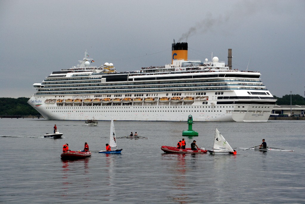 Zahlreiche "Sehleute" genießen an Oberdeck das Auslaufmanöver mit der "Costa Pacifica" auf der "Kieler Förde"