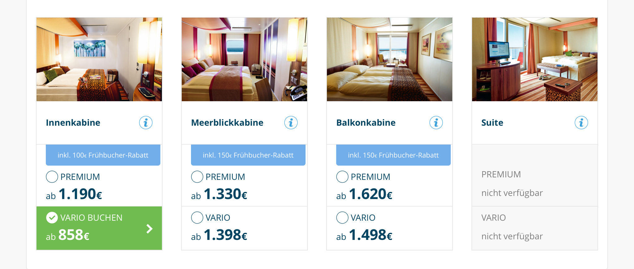 Bei unserer Buchung (Norwegen mit der Prima) war das lange so und hat sich bis zum Schluss nicht verändert. Es ging um eine Einzelbelegung, die im Premium ca. 150-200 € günstiger als im Vario lag.