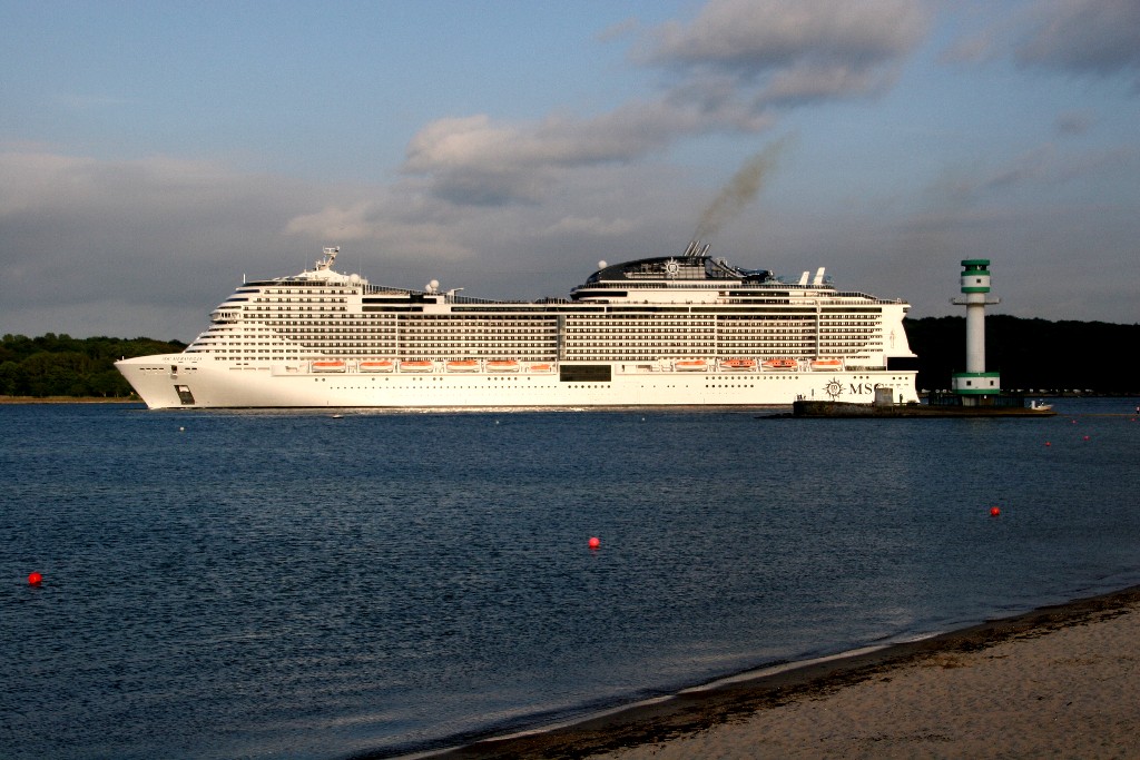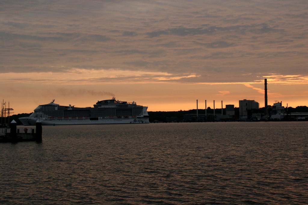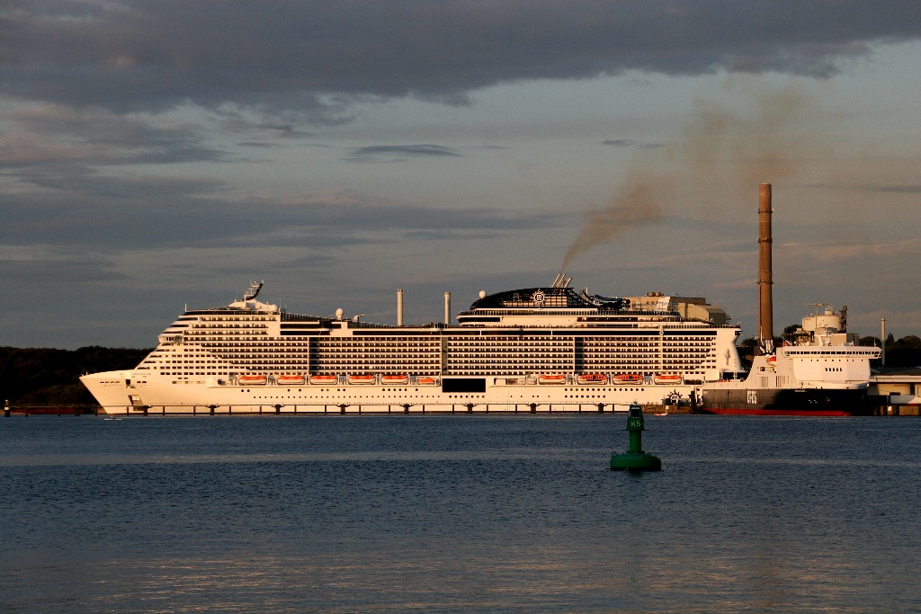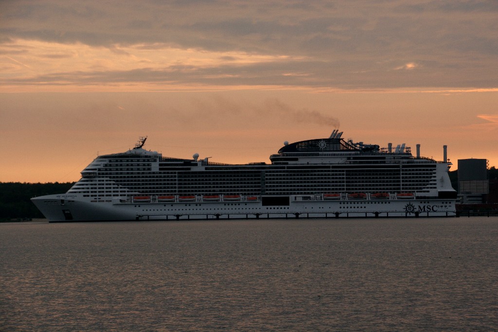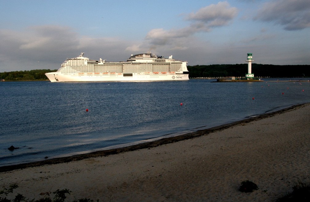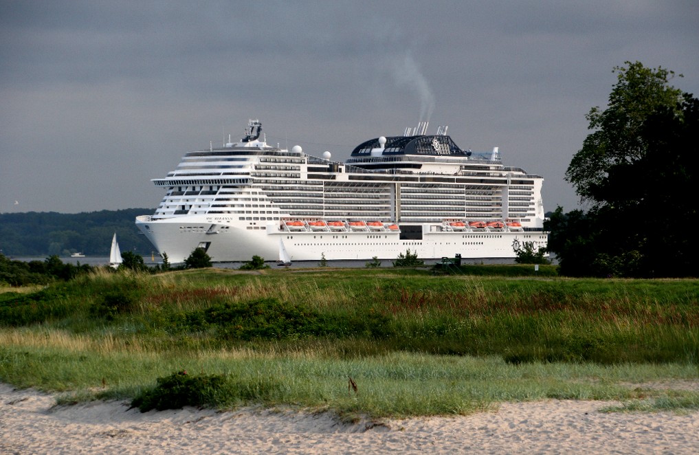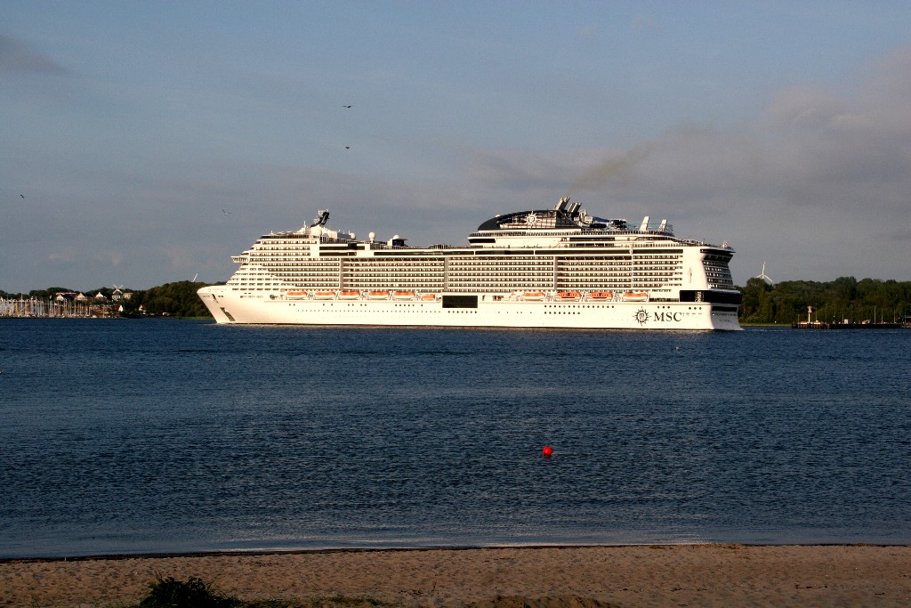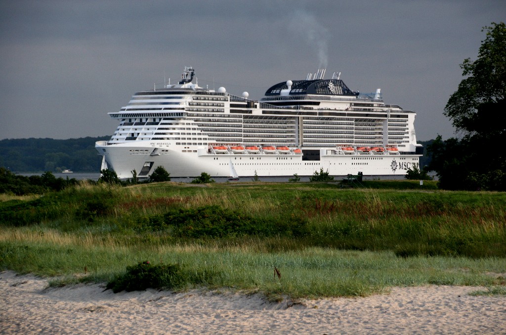 Am südlichen Ende vom "Falkensteiner Strand" habe ich ein traumhaftes Panorama auf die "MSC Meraviglia" während ihrer "Revierfahrt" auf der "Kieler Förde"