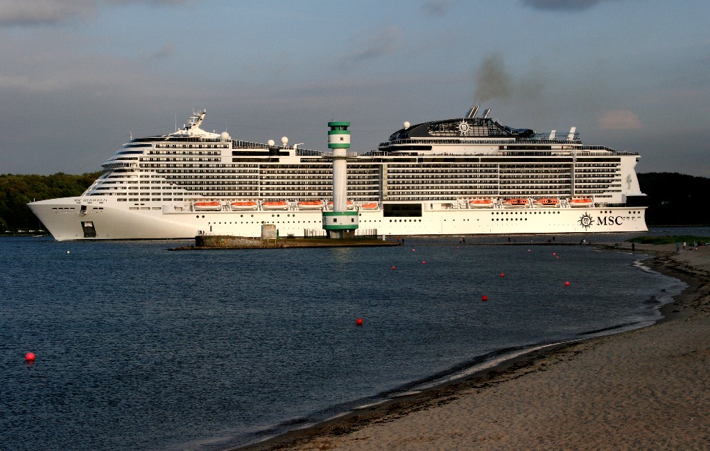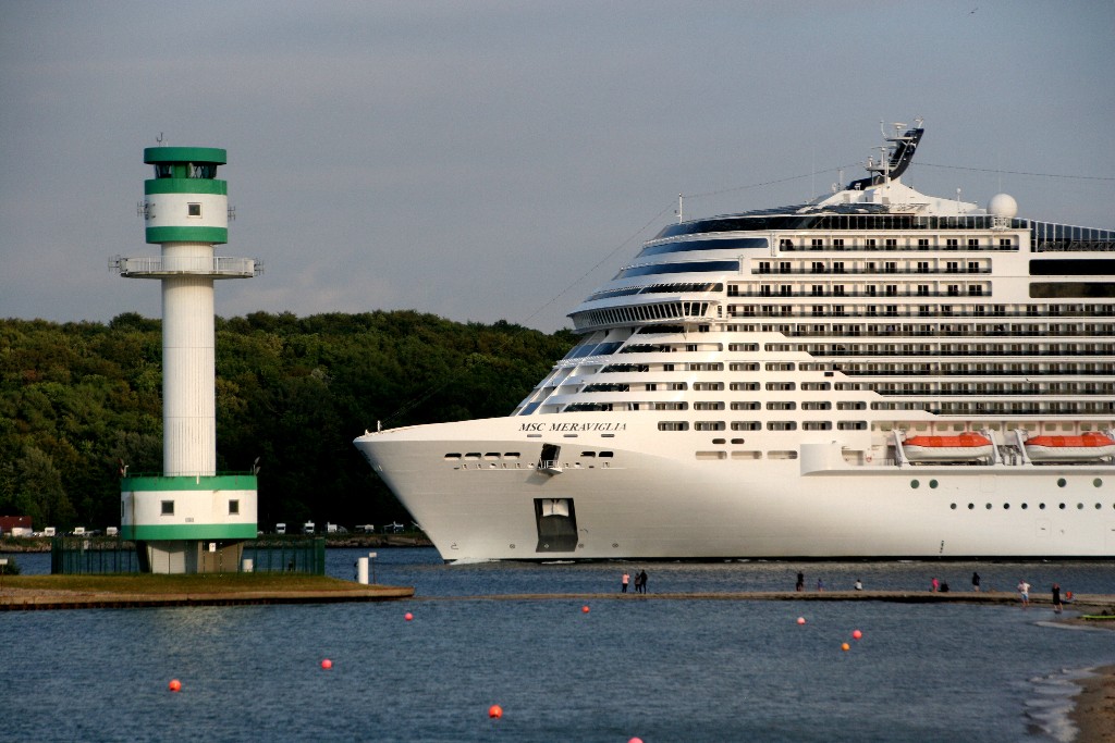 Die "MSC Meraviglia" fährt während ihrer Revierfahrt auf der "Kieler Förde" in Richtung "Friedrichsorter Leuchtturm"