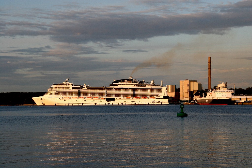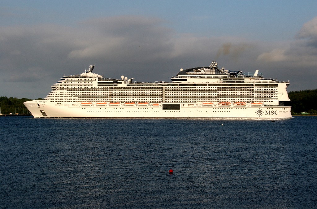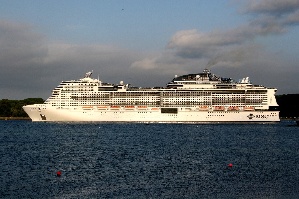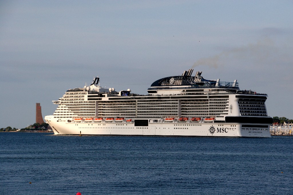 Die "MSC Meraviglia" kommt am 13.07.2019 um 19:49h während ihrer Revierfahrt auf der "Kieler Förde" um die Ecke gefahren