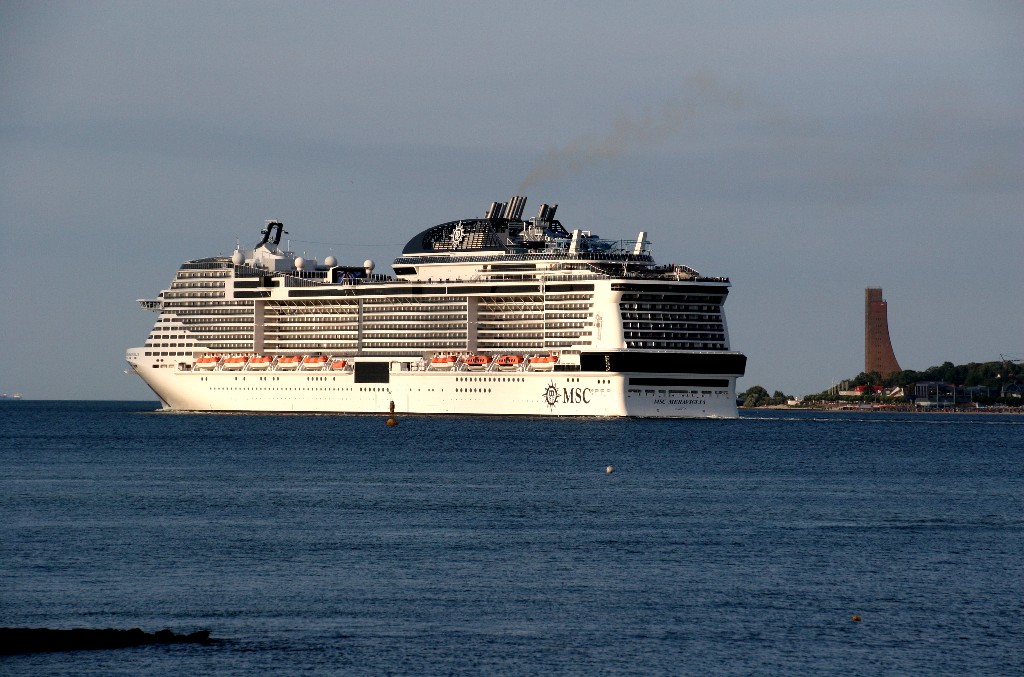 Die "MSC Meraviglia" ist kurz vor dem futuristischen "Marine-Ehrenmal" in Laboe
