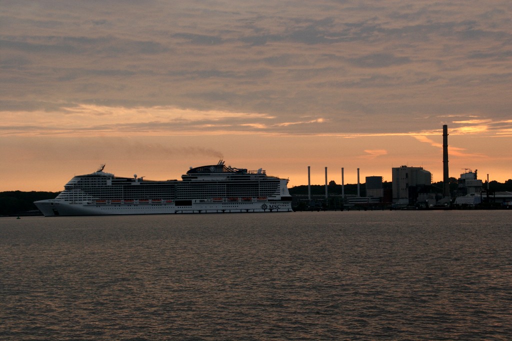 Die "MSC-Meraviglia" fährt in stimmungsvoller Atmosphäre ihr Auslaufmanöver im Ostuferhafen