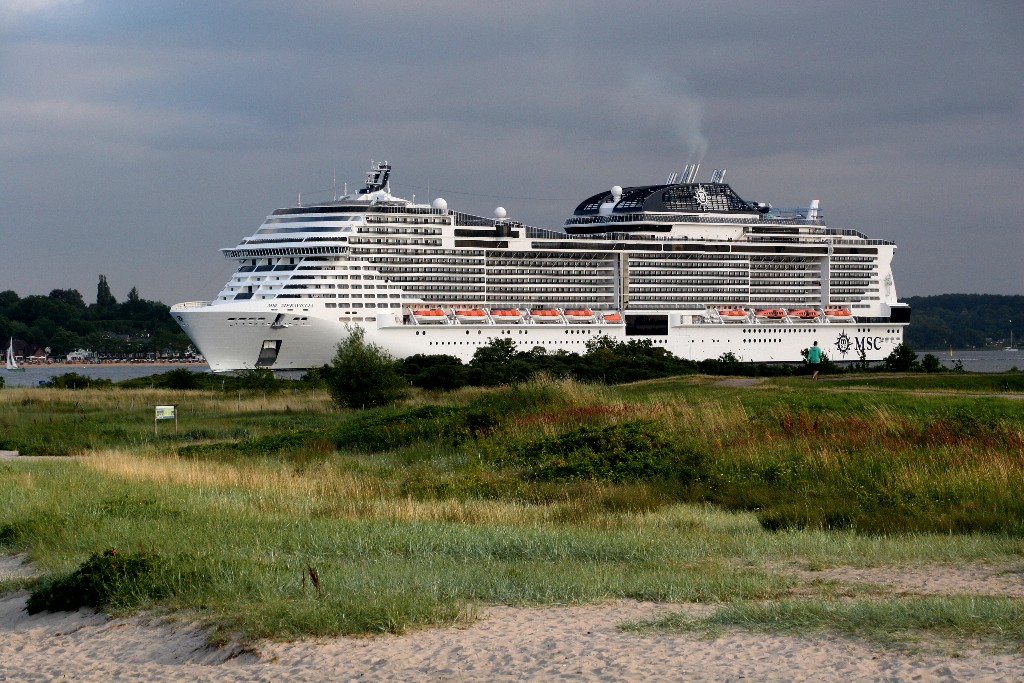 Am südlichen Ende vom "Falkensteiner Strand" habe ich ein traumhaftes Panorama auf die "MSC Meraviglia" während ihrer "Revierfahrt" auf der "Kieler Förde"