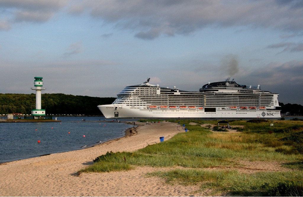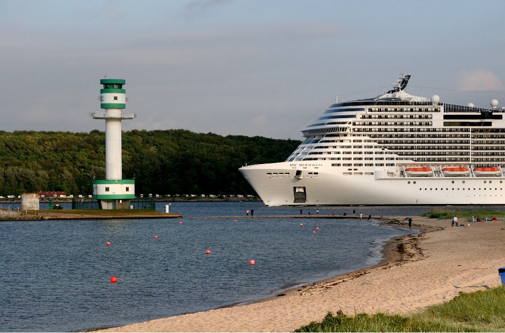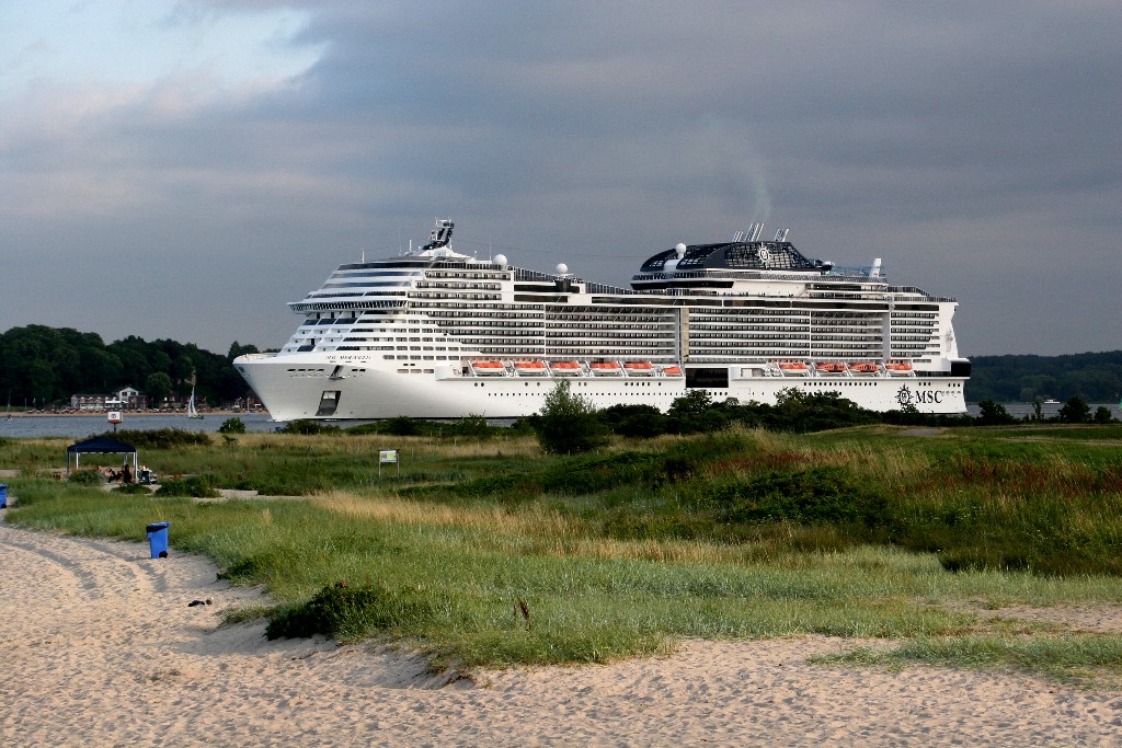 Am südlichen Ende vom "Falkensteiner Strand" habe ich ein traumhaftes Panorama auf die "MSC Meraviglia" während ihrer "Revierfahrt" auf der "Kieler Förde"