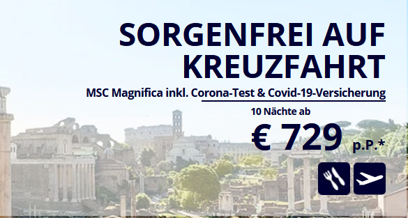 Um eine maximale Sicherheit für Ihre Kreuzfahrt zu gewährleisten, ist eine COVID-19-Versicherung bei allen Abfahrten der MSC Magnifica bis einschließlich 18.12.2020 bereits im Kreuzfahrtpreis enthalten. Die Versicherung wird automatisch kostenfrei zu Ihrer Buchung hinzugefügt und deckt die Risiken im Zusammenhang mit einer COVID-19-Erkrankung vor Reiseantritt, während und nach der Kreuzfahrt. Mit der Covid-19-Versicherung werden eventuell entstehende Kosten für Reiserücktritt und Stornierung, für die medizinische Behandlung und Medikamente an Bord oder im Krankenhaus sowie die Kosten für den medizinischen Rücktransport der erkrankten Person inklusive einer Begleitperson übernommen. Wir empfehlen zusätzlich den Abschluss einer regulären Reiseversicherung.