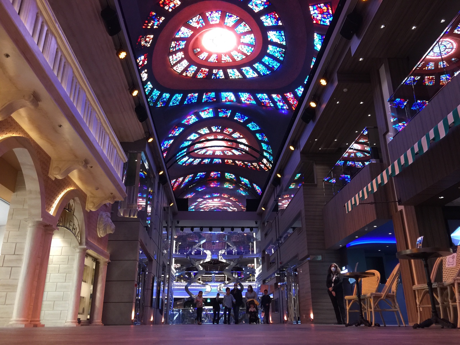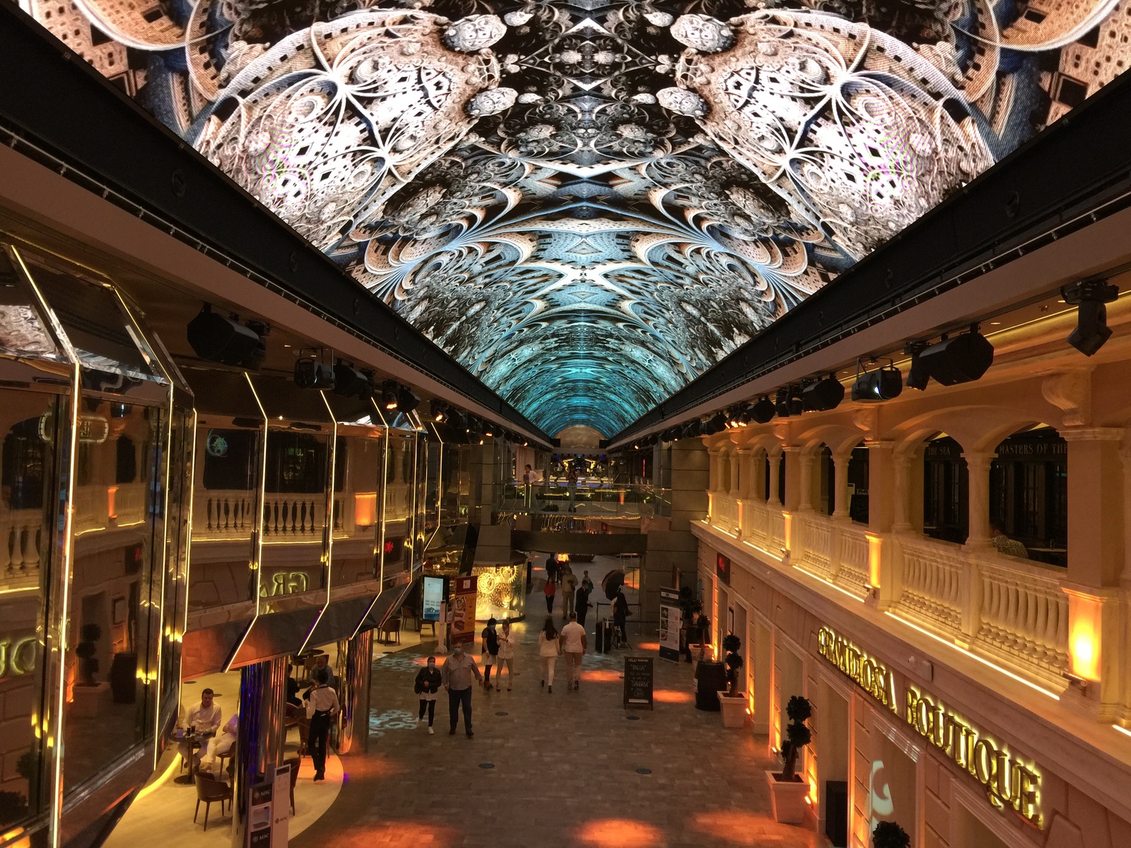 Schiff: Der LED-Himmel auf der Piazza auf dem 6./7. Deck ist spektakulär. Verschiedene Stimmungen, alle Stunde wechselt der Himmel und Lichtshows.