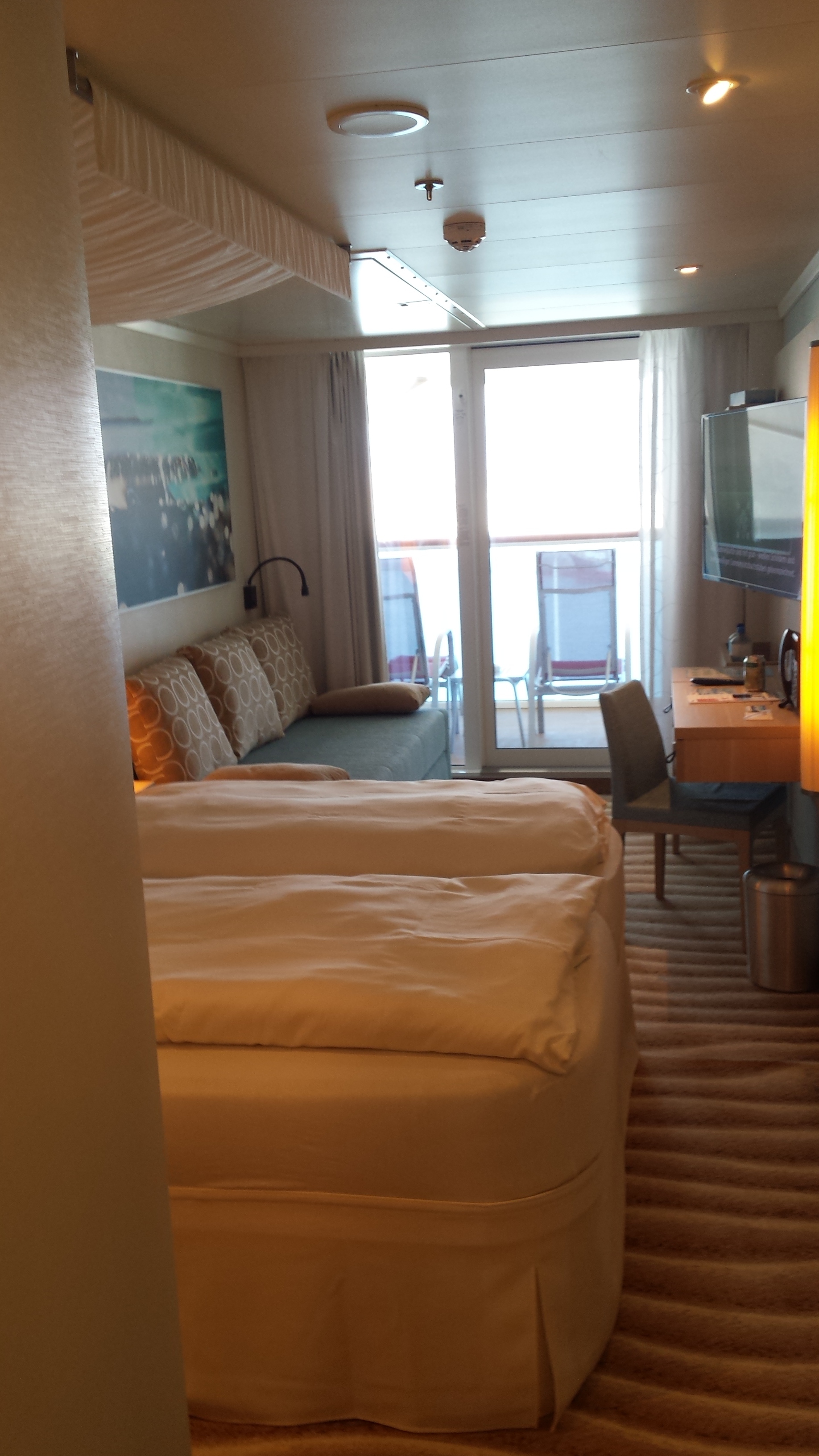 Leider ist die Kabine unter dem großen (3 m, 4 m?) Dachvorsprung, so dass so gut wie keine Sonne auf den Balkon kommt. Morgens hatten wir mal von 7.30 bis 8 Uhr sonne ![]()