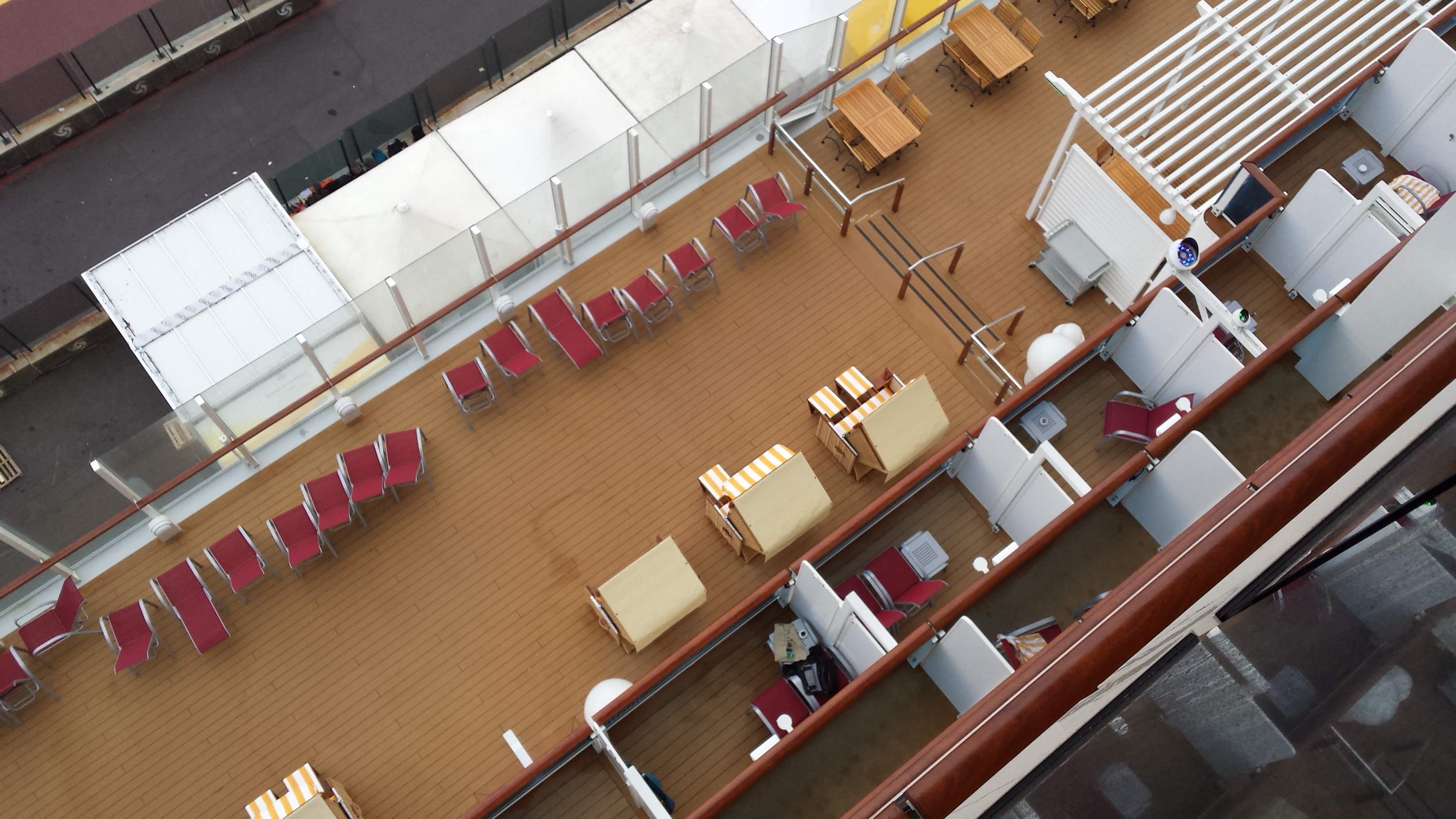 Leider ist die Kabine unter dem großen (3 m, 4 m?) Dachvorsprung, so dass so gut wie keine Sonne auf den Balkon kommt. Morgens hatten wir mal von 7.30 bis 8 Uhr sonne ![]()