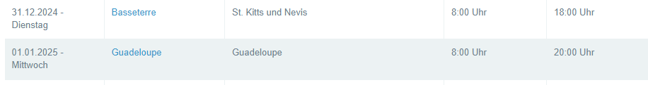 Das Schiff ist am 31.12.2024 bis 18:00 Uhr auf St. Kitts, am 01.01.2025 legt das Schiff um 08:00 Uhr auf Guadeloupe an.