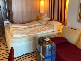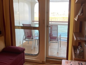 Die Kabineliegt nah am Treppenhaus und ist ruhig und schön nah am Meer, hat eine großes Bett und ein Schlafsofa. Die Klimaanlage läßt sich nie ganz abstellen, trotz geöffneter Balkontür. Hier handelt es sich übrigens um eine Klapptür. Wir hatten einen kleien Spanngurt dabei, damit diese offen blieb. Veranda / Balkon istt recht groß und bietet ausreichend Platz für 2 Stühle und die Hängematte. Es handelt sich hier aber eher um ein großes Loch in der Bordwand, daher aber auch von außen nicht einsehbar.