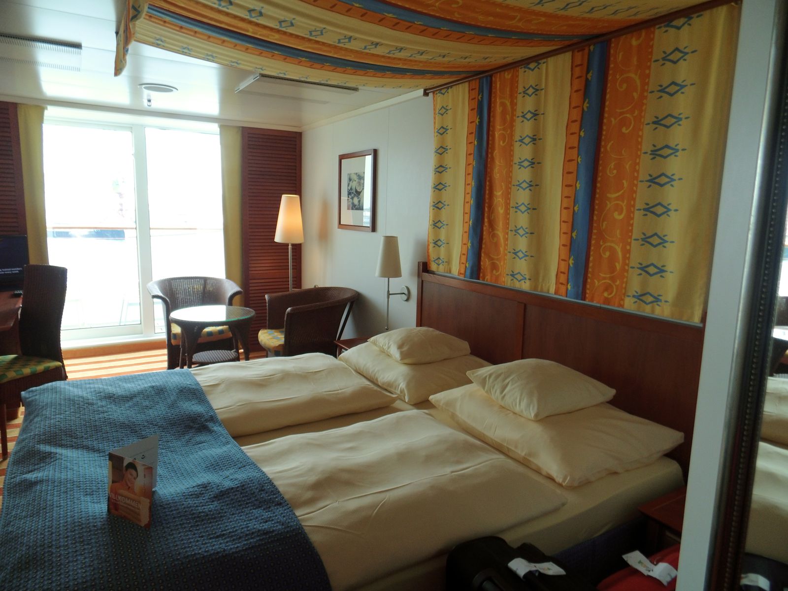 Dies ist eine normale Balkonkabine, vom hinteren Treppenhaus aus die 5. Kabine an Backbord. Hinten durch geht es direkt zur Ocean Bar, also eine Top Lage. Das Bett ist rechts, also Kopfende in Fahrtrichtung.