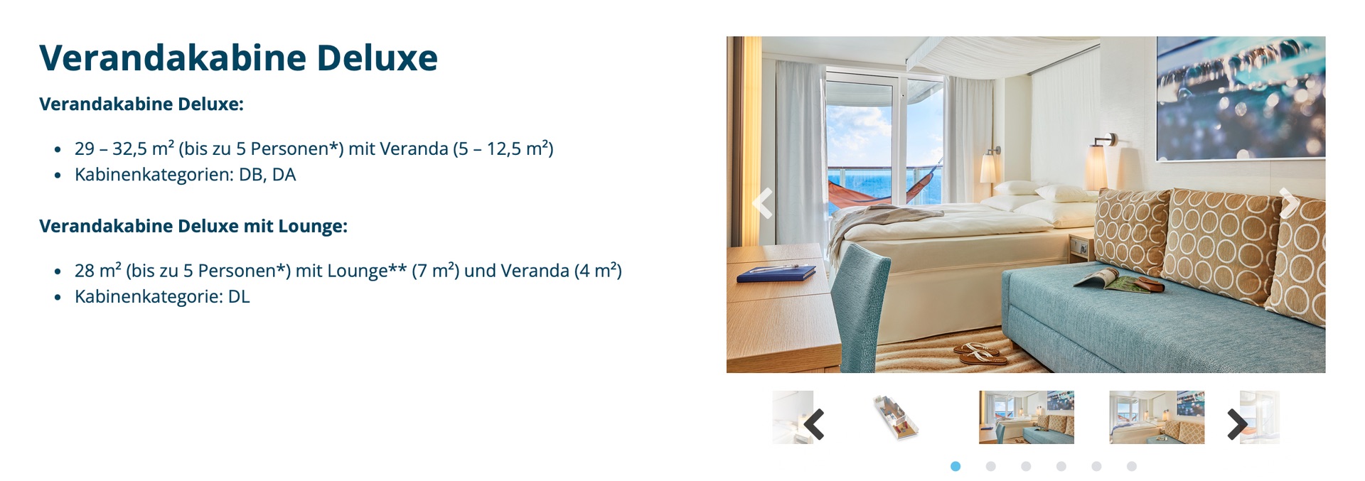 Tatsächlich ist es umgekehrt: Veranda Komfort sind die Kabinen mit extra viel Platz oder begehbarem Kleiderschrank. Veranda Deluxe sind die mit dem Wintergarten und besonders gut einsehbarem Balkon. Balkonkabinen sind meines Erachtens die auf Deck 5 - der Balkon ist ziemlich klein aber dafür ist man besonders dicht am Wasser. Muss man für sich entscheiden, was man bevorzugt. Unsere erste Wahl auf Prima/Perla/Nova/Cosma - erst recht im Vario - sind Veranda Komfort.
