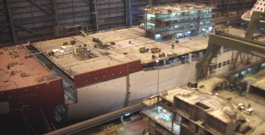 In anderen Worten würde ich darauf wetten, dass demnächst die Odyssey of the seas ins Werftbecken verlegt wird, das AIDA Cosma Schwimmtteil nach drinnen wandert und mit dem aktuell ebenfalls in der Halle liegenden Bugabteil der Cosma verbunden wird und dass dann etwas später das Disney Schwimmtteil den Rest der Halle 6 ausfüllt. Die Odyssey würde dann im Werftbecken überwintern und dort endausgerüstet werden.