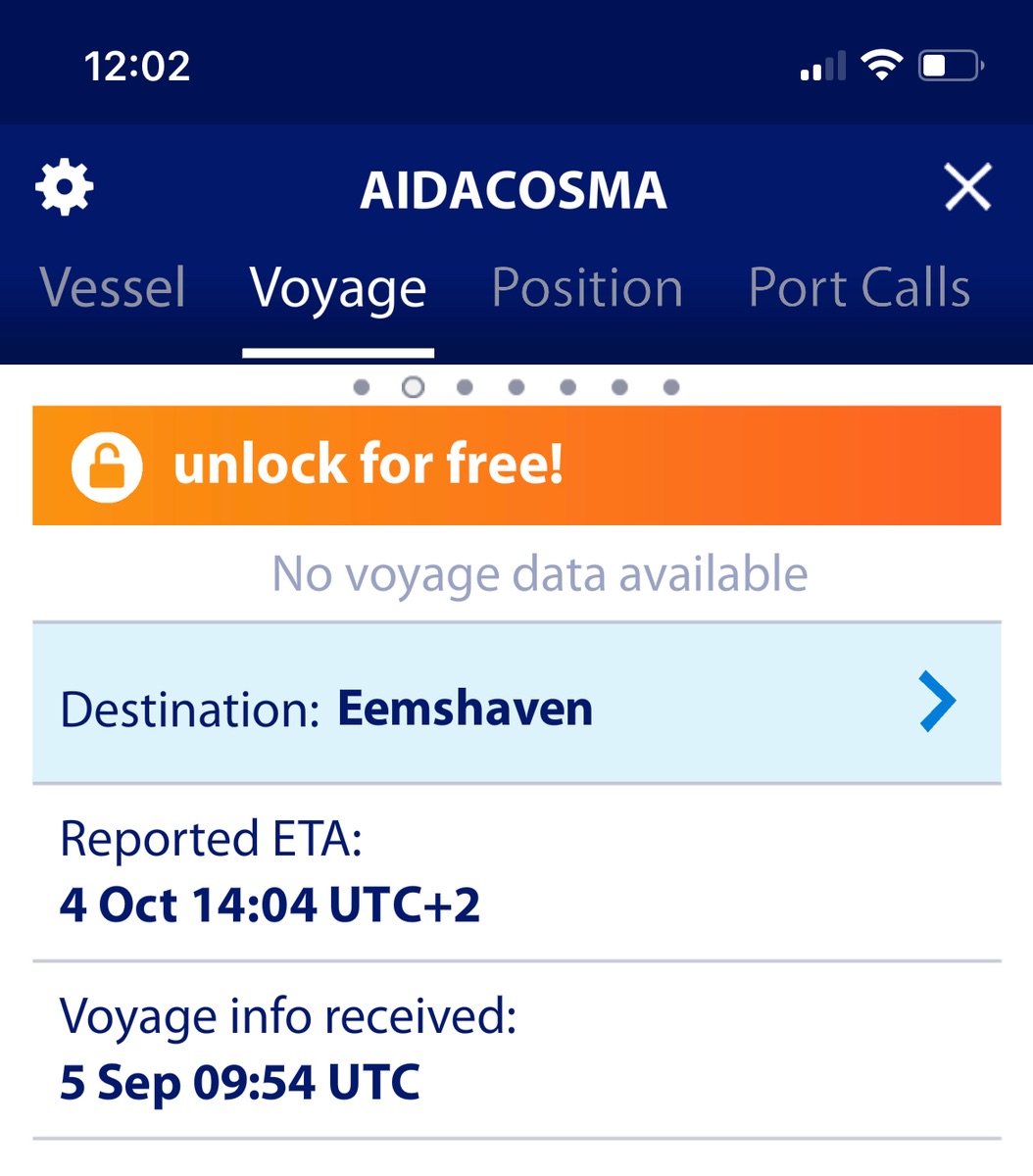 Lt. Traffic wird AIDAcosma am 04.10.2021 in Eemshaven erwartet. Daher wird vermutet, dass um den 02.10.2021 die Überführung ab Meyer Werft startet.