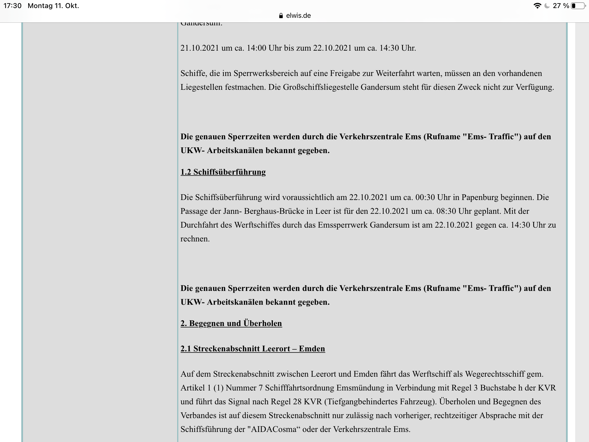 Das NLWKN hat heute eine Vormerkung rausgeben. wonach die Ems zwischen dem 21.10 und 23.10.2021 für den allgemeinen Schiffsverkehr gesperrt ist ;-).