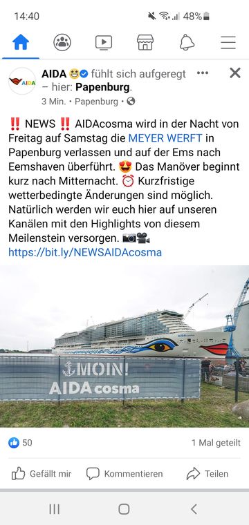Hier der Link zur Pressemitteilung der Meyer-Werft: https://www.meyerwerft.de/de/presse/pres…berfuehrung.jsp