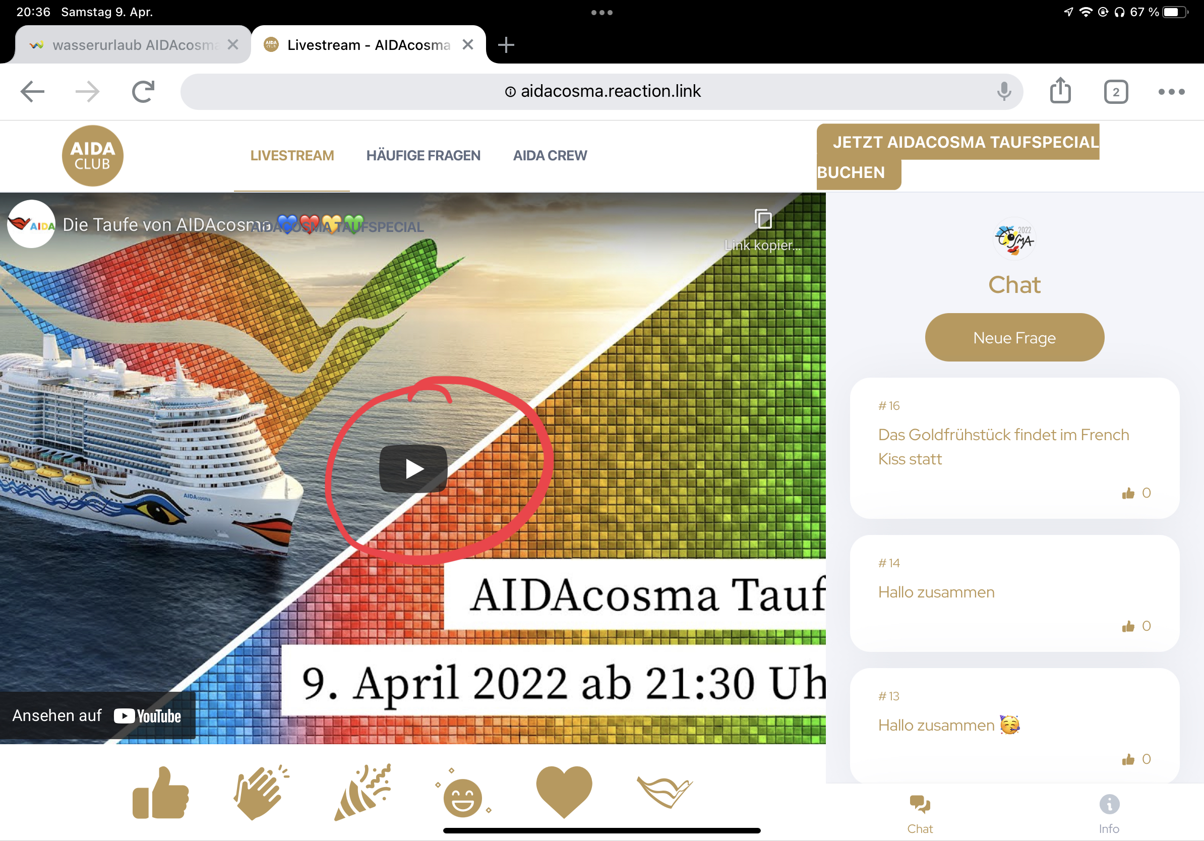 Auf der Seite ist links der Standard-YouTube-Stream von der Taufe eingebunden - der startet automatisch um 21:15, Uhr wenn man auf den Pfeil geklickt hat. Was jetzt noch zusätzlich läuft (seit 20:30 Uhr), ist die Chat-Möglichkeit mit dem in der Mail genannten AIDA-Team.