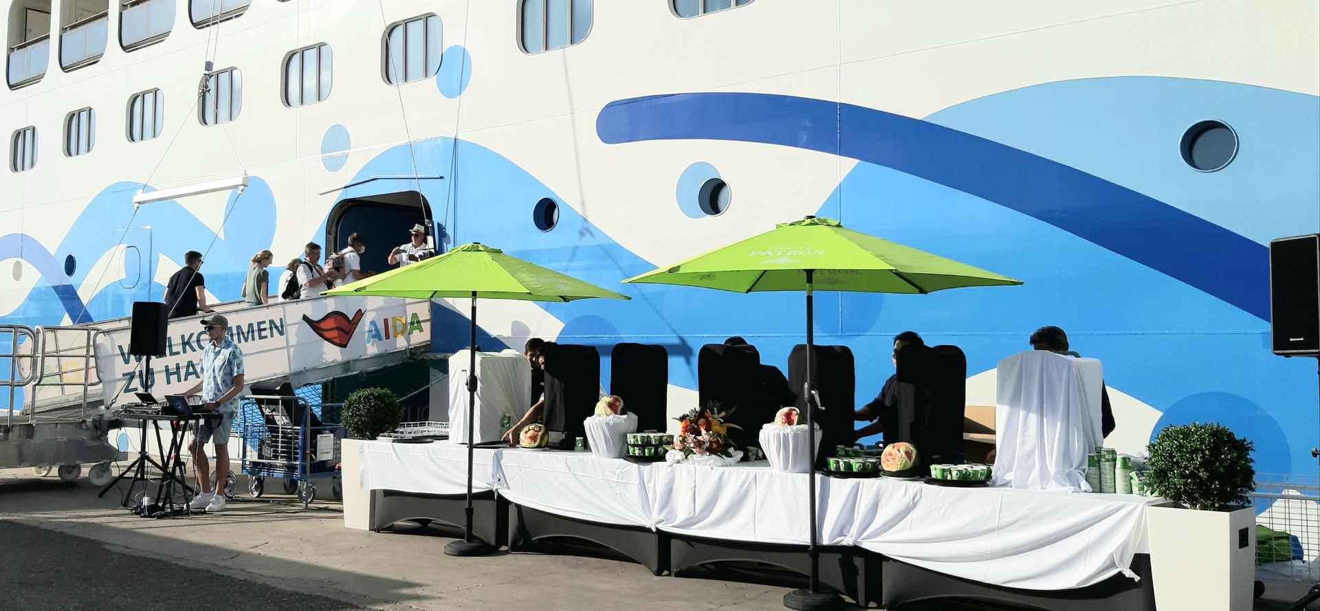 Was für eine Begrüßung heute Abend als wir gefühlt mit einer Massenankunft der Ausflugsbusse in Civitavecchia gegen 18.30 Uhr angekommen sind. DJ mit Pult vor dem Schiff , Begrüssungsgetränke mit lecker Matcheistee und anderen Kaltgetränken wurden zahlreich vor dem Schiff verteilt